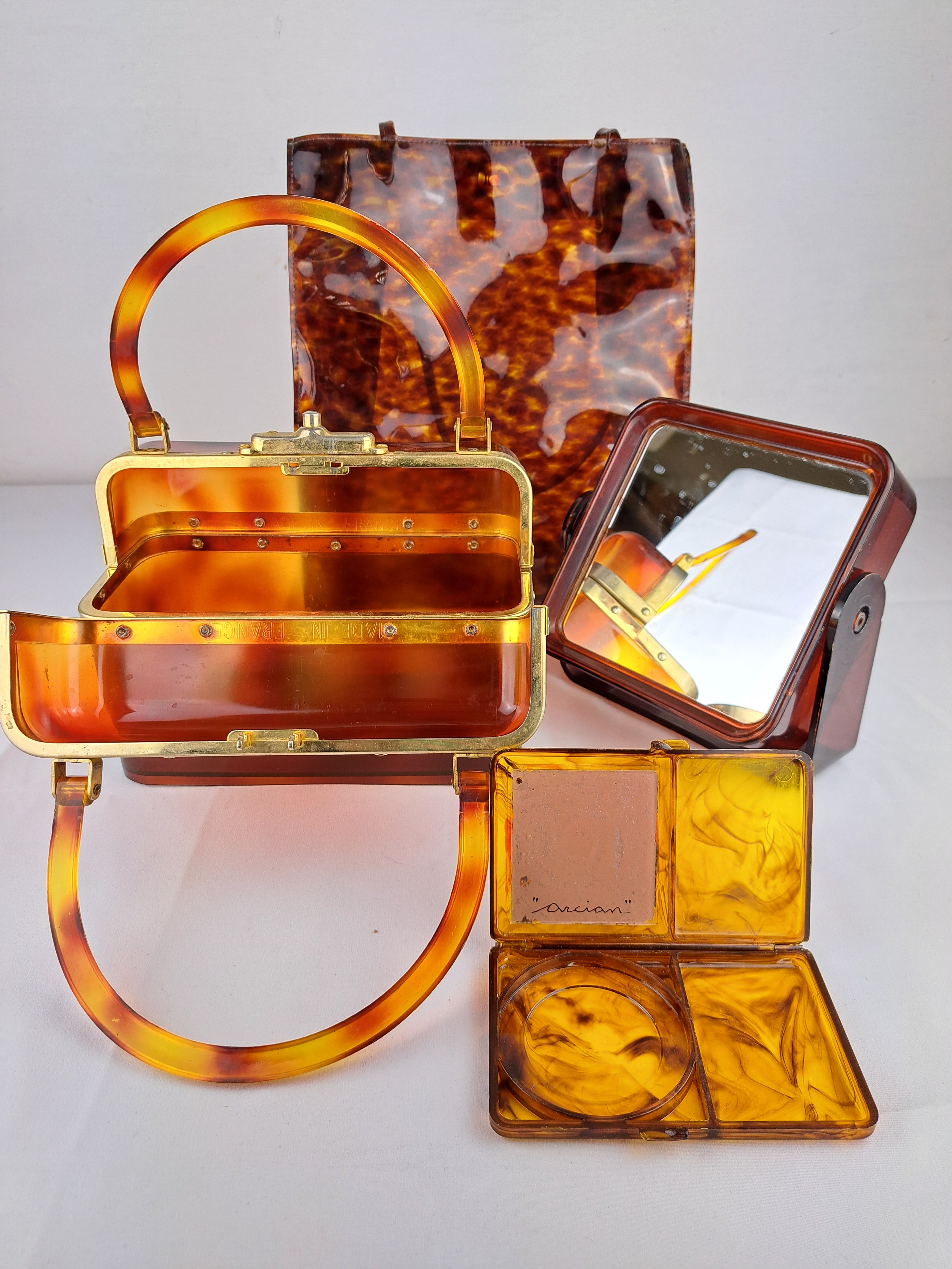 Prezzo di listino €35,00Borsa in PVC effetto tartarugato semitrasparente. Chiusura con bottone a pressione. Anni 70, ottime condizioni 27 x 30 x 12 cm -