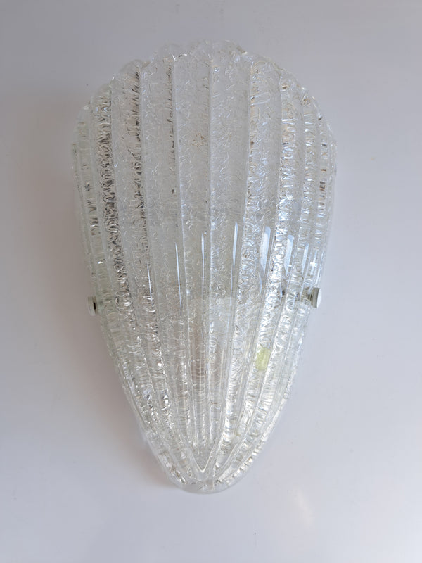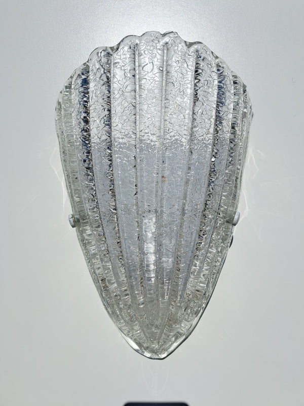 Prezzo di listino €50,00Lampada da parete, produzione attribuibile alla lavorazione del vetro di Murano nello stile di Barovier & Toso, anni 70. Paralume in vetro graniglia a forma di scudo triangolare o conchiglia con scanalature e bordo superiore ondulato,... -