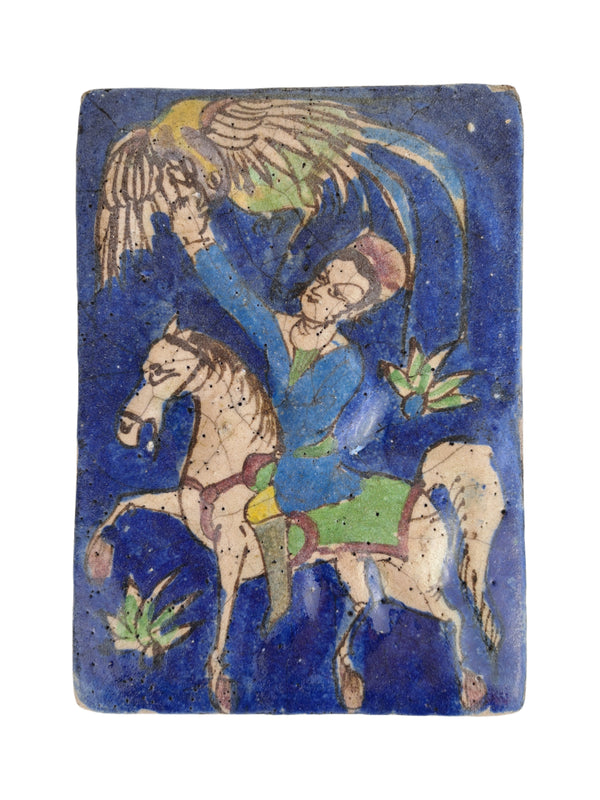 Prezzo di listino €140,00Piastrella in maiolica sui toni del blu con disegno di uomo a cavallo in abiti tradizionali con la mano sollevata verso un uccello, probabilmente un uccello Huma che nella mitologia persiana è simbolo di fortuna, libertà, felicità... -