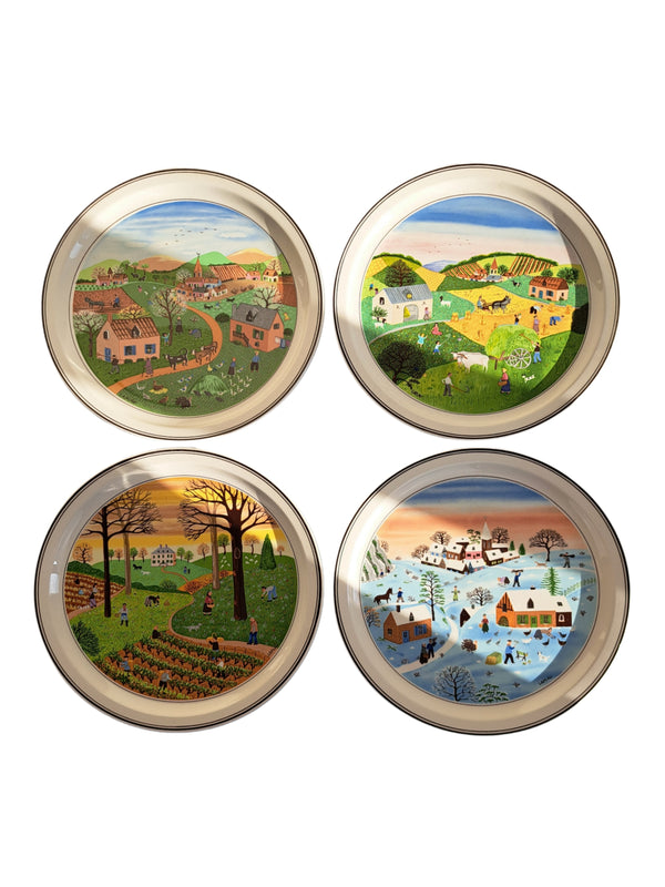 Prezzo di listino €120,00Serie di 4 piatti decorativi in ceramica che rappresentano le 4 stagioni con disegni di paesaggi in stile naif di Gerard Laplau, prodotti da Villeroy & Boch negli anni 80. Sul fronte i disegni delle 4... -