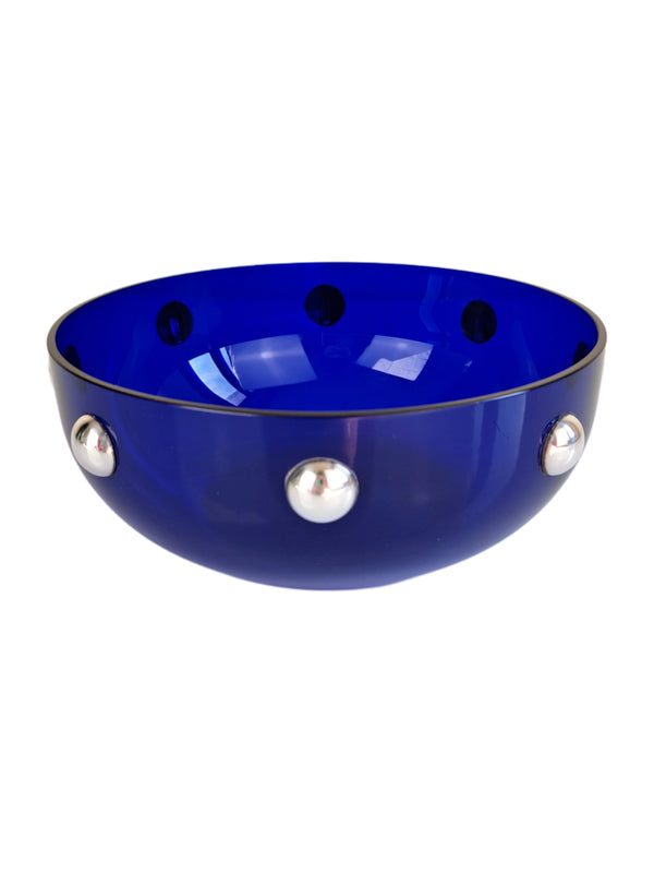 Prezzo di listino €120,00Ciotolina in vetro di Murano colore blu con inserti a cabochon in metallo argentato, design Cleto Munari anni '80. Ciotola in vetro di forma circolare con mezzesfere argentate disposte lungo la circonferenza. Bollino con marchio del...