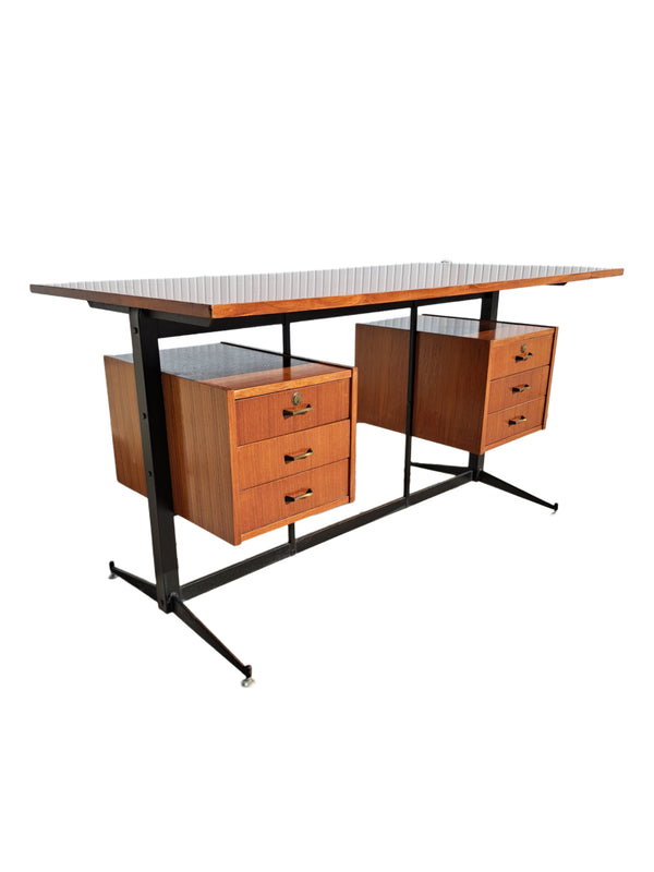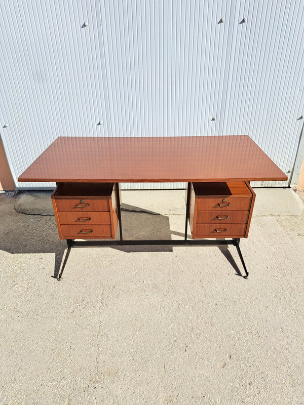 Prezzo di listino €140,00Scrivania con 6 cassetti in legno impiallacciato teak con struttura in metallo nero e piedini in ottone. Pratica postazione di studio o lavoro dal fascino vintage anni 70. Buone condizioni generali con struttura solida e cassetti... -