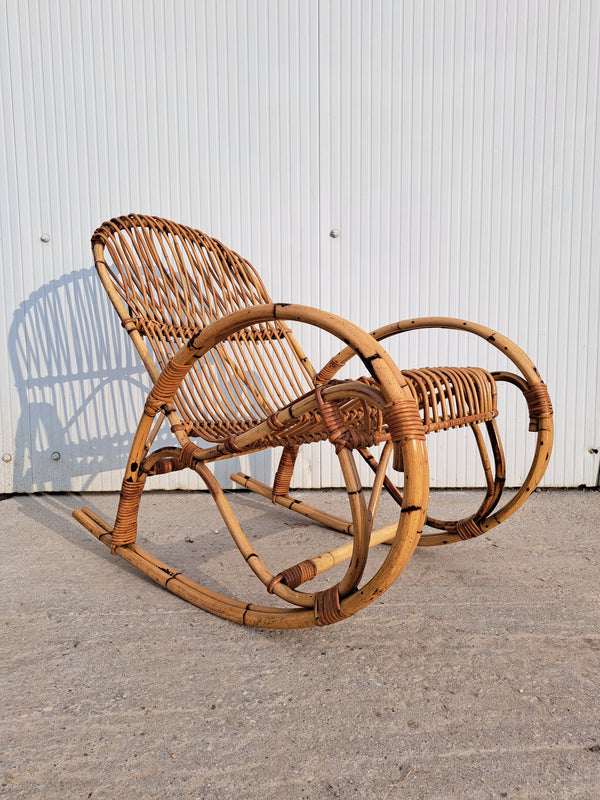 Prezzo di listino €80,00Poltrona a dondolo in bambù e rattan intrecciato, produzione italiana anni 60. Disponibile anche il cuscino con fodera a fasce bianche e verdi. Adatta per l'interno o esterno coperto come una veranda o portico, comoda e... -