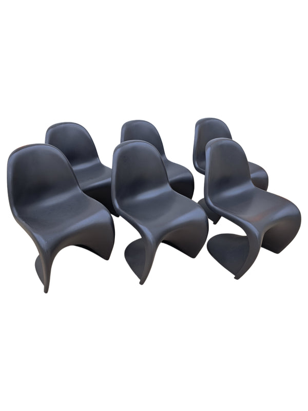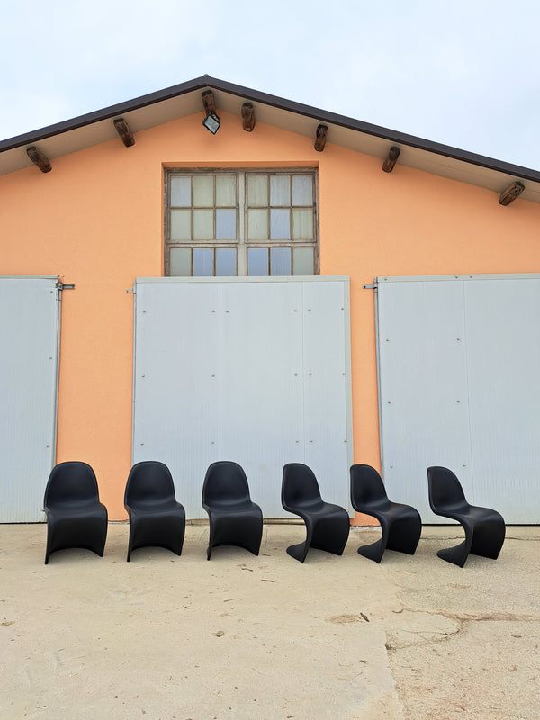 Prezzo di listino €700,00Set di 6 sedie in plastica polipropilene nero opaco, disegnate da Verner Panton per Vitra, in produzione dal 1967. Design ricercato con linee sinuose e seduta a sbalzo, impilabili, leggere e comode. Sedie d'avanguardia entrate nella... -