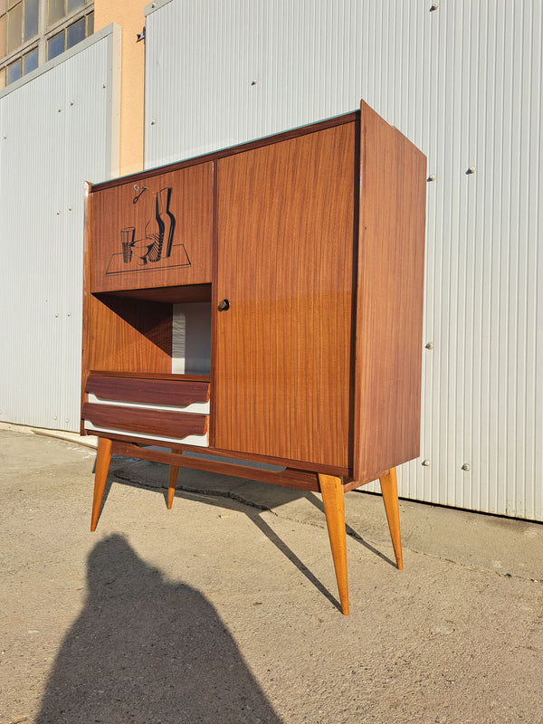 Prezzo di listino €300,00Mobile bar in legno, produzione italiana anni 50 / 60 con disegno a silhouette di bottiglie e bicchieri. Credenza compatta e funzionale con ripiani, ante e cassetti, corpo sollevato su alte zampe a spillo. Colore marrone... -