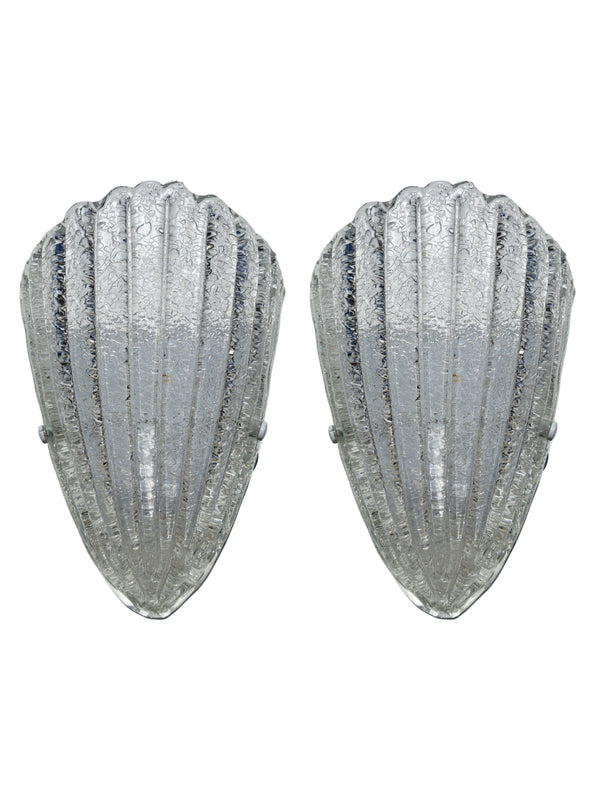 Prezzo di listino €160,00Coppia lampade da parete, produzione attribuibile alla lavorazione del vetro di Murano nello stile di Barovier & Toso, anni 70. Paralume in vetro graniglia a forma di scudo triangolare o conchiglia con scanalature e bordo superiore... -