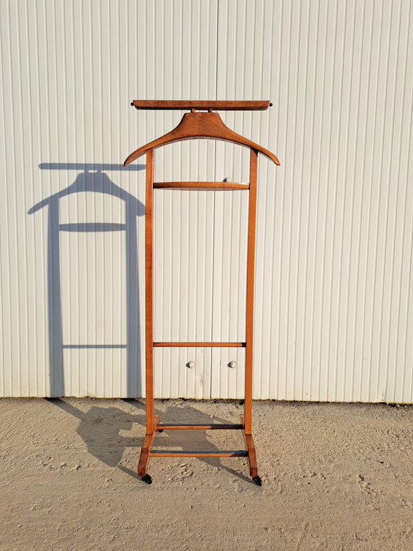 Prezzo di listino €50,00Appendiabiti servomuto in legno e ottone prodotto dai Fratelli Reguitti negli anni 50 / 60. Il porta abiti è composto da una base poggiascarpe con rotelle e una struttura verticale con stampella porta giacca e camicia,... -