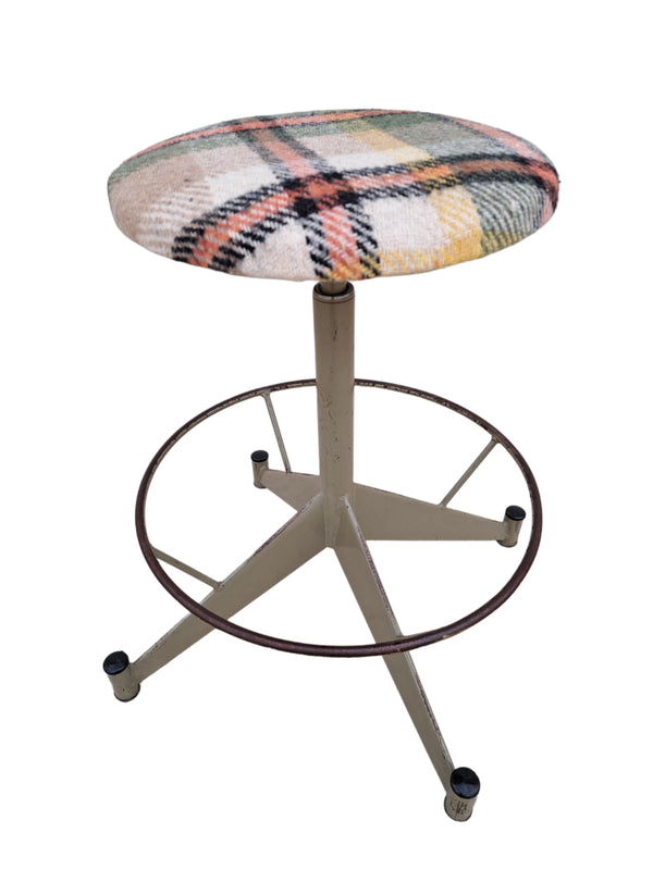 Prezzo di listino €70,00Sgabello industriale con struttura in metallo verniciato verde militare e seduta imbottita rivestita con tessuto tartan nei colori verde, giallo, rosso, nero, e bianco. Altezza della seduta regolabile con funzionamento a vite e anello poggiapiedi collegato... -