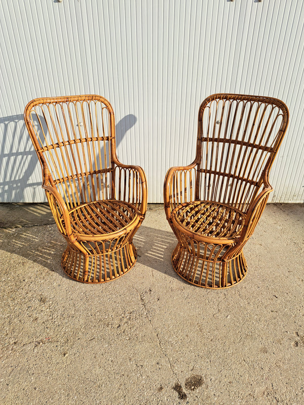 Prezzo di listino €200,00Coppia di poltroncine in bambù e rattan, produzione italiana anni 60. Sedie con forma a calice in bambù intrecciato con schienale alto e braccioli. Disponibili anche i cuscini della seduta e dello schienale con fodera a... -