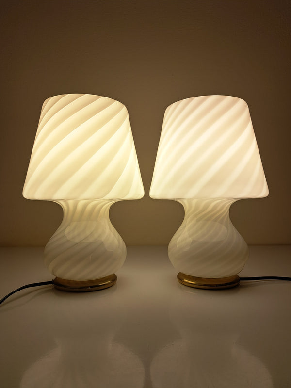 Prezzo di listino €180,00Coppia di lampade a forma di fungo in vetro a canne bianche con decoro a spirale e base in metallo dorato. Lavorate con le tecniche muranesi e attribuibili alla produzione di Lino Tagliapietra per Venini negli... -