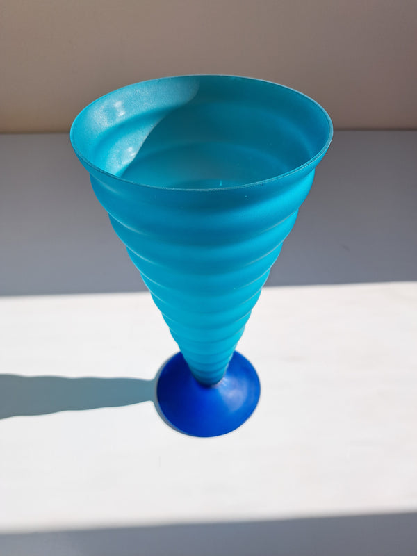 Prezzo di listino €35,00Vaso in vetro satinato azzurro e blu, produzione anni 80 attribuibile alla lavorazione del vetro artistico di Murano. Vaso a cono in vetro azzurro con bombature orizzontali e base circolare in vetro blu. Stile postmoderno con... -