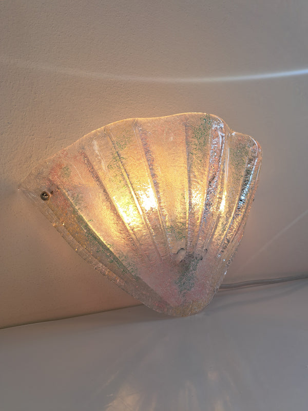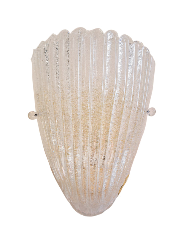Prezzo di listino $96.00Lampada da parete singola, produzione attribuibile alla lavorazione del vetro di Murano nello stile di Barovier & Toso, anni 80. Paralume in vetro graniglia trasparente a forma di scudo triangolare o conchiglia con scanalature e bordo... -