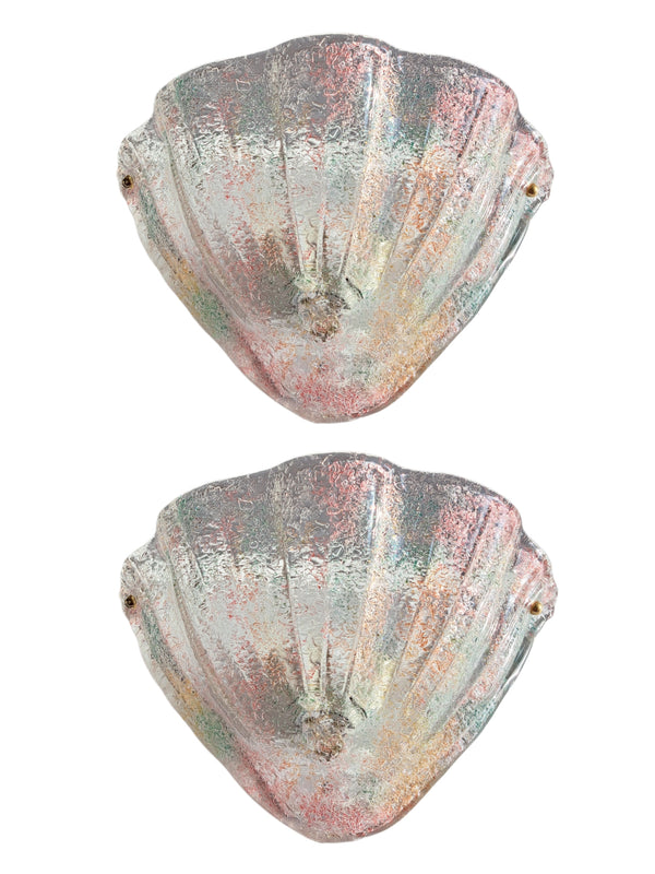 Prezzo di listino $168.00Coppia lampada da parete in stile classico veneziano, anni 80/90. Forma a conchiglia con bordo ondulato e scanalature, decorate in vetro graniglia colorato con sfumature verdi rosa e gialle e inserti in metallo dorato, predisposte per... -