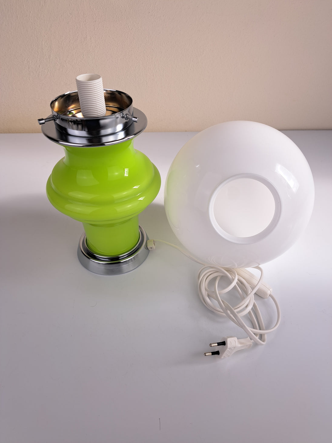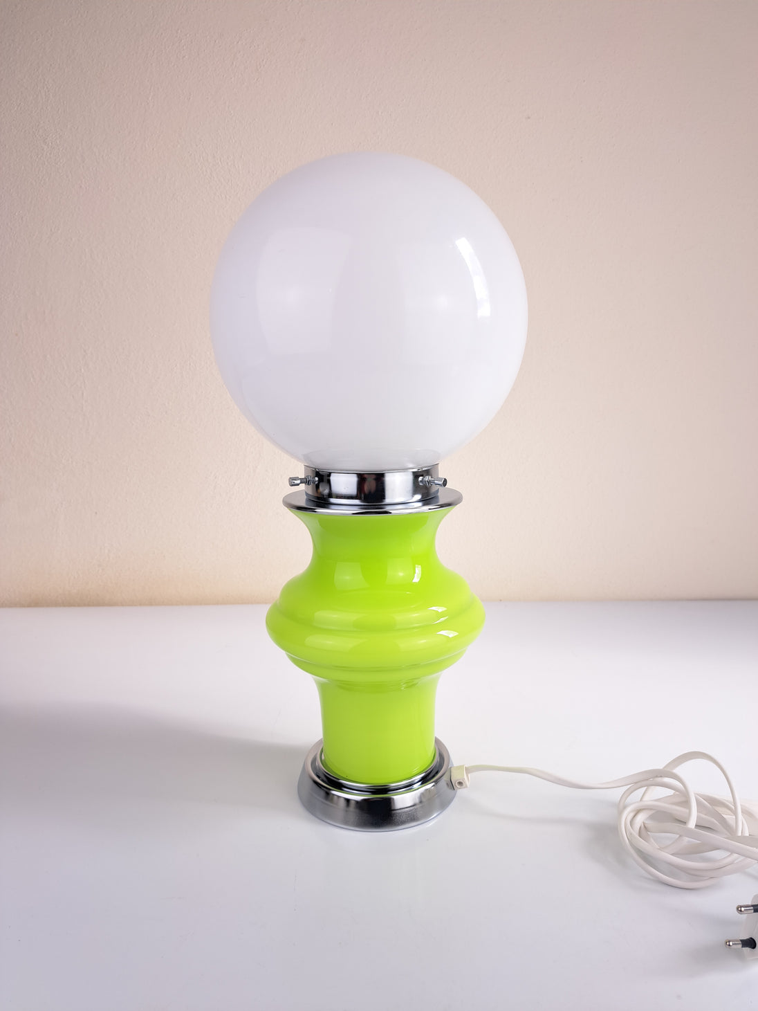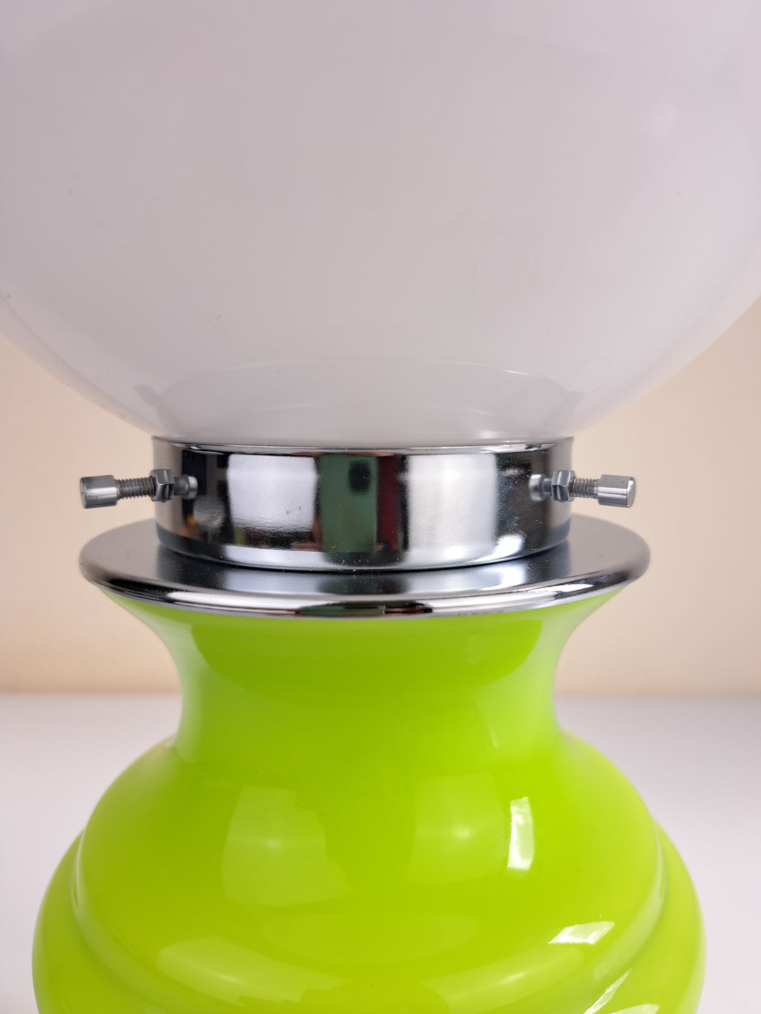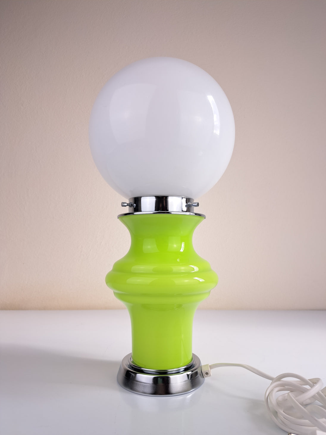Lampada da tavolo anni 70 di produzione italiana con inserti in metallo cromato, corpo in vetro colore verde acido e testa in vetro a sfera colore bianco. Ottime condizioni generali, proveniente da fondi di negozio, vetri anni 70 con impianto elettrico rifatto a nuovo, 1 punto luce in corrispondenza della testa sferica con attacco portalampada E14. Questa lampada dai colori vivaci saprà catturare l'attenzione dei vostri ospiti dando carattere e stile vintage alla tua stanza. Disponibile 1 lampada.