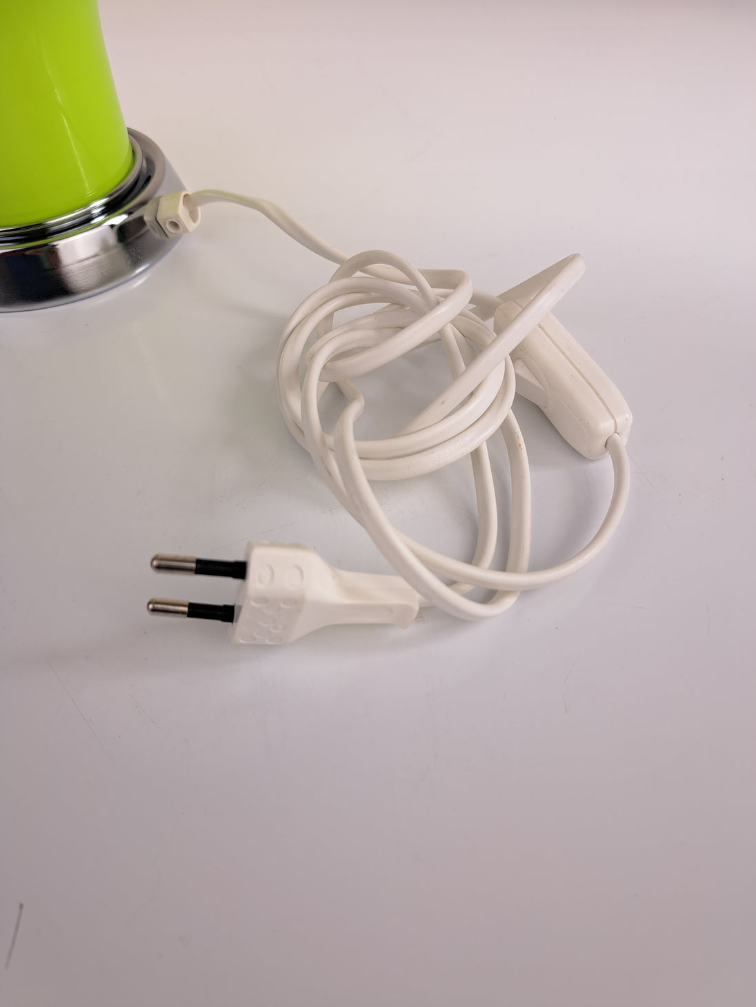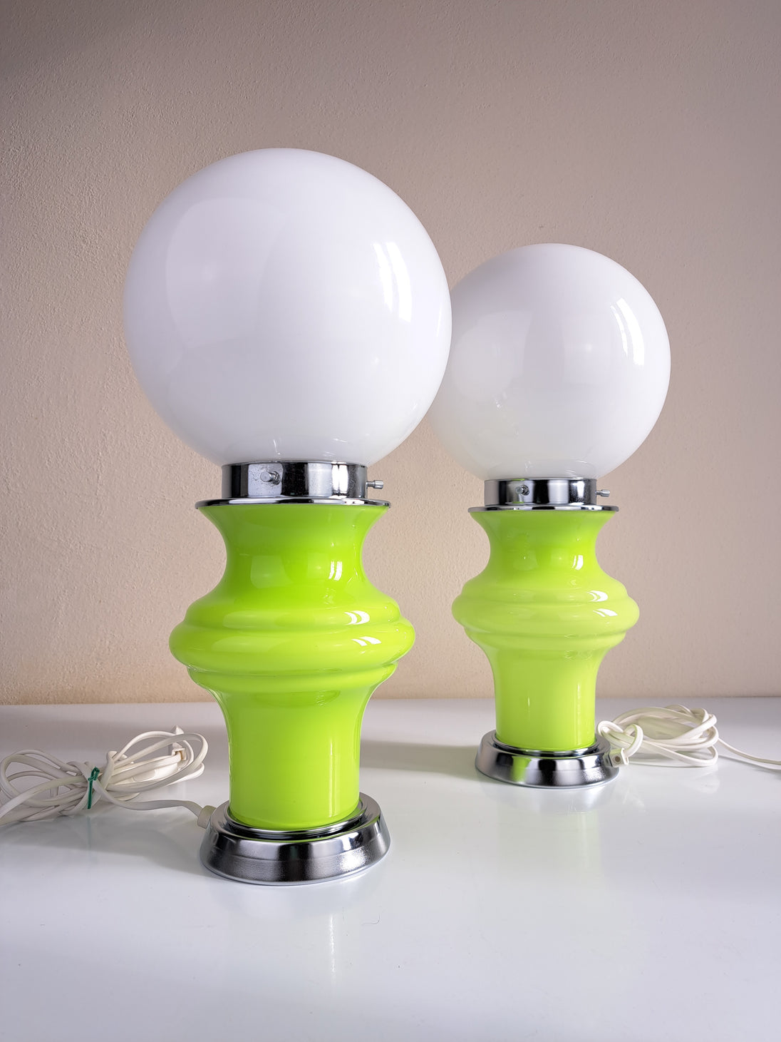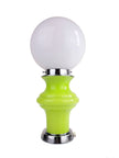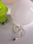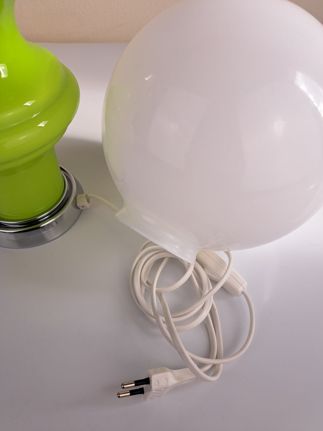 Lampada da tavolo anni 70 di produzione italiana con inserti in metallo cromato, corpo in vetro colore verde acido e testa in vetro a sfera colore bianco. Ottime condizioni generali, proveniente da fondi di negozio, vetri anni 70 con impianto elettrico rifatto a nuovo, 1 punto luce in corrispondenza della testa sferica con attacco portalampada E14. Questa lampada dai colori vivaci saprà catturare l'attenzione dei vostri ospiti dando carattere e stile vintage alla tua stanza. Disponibile 1 lampada.