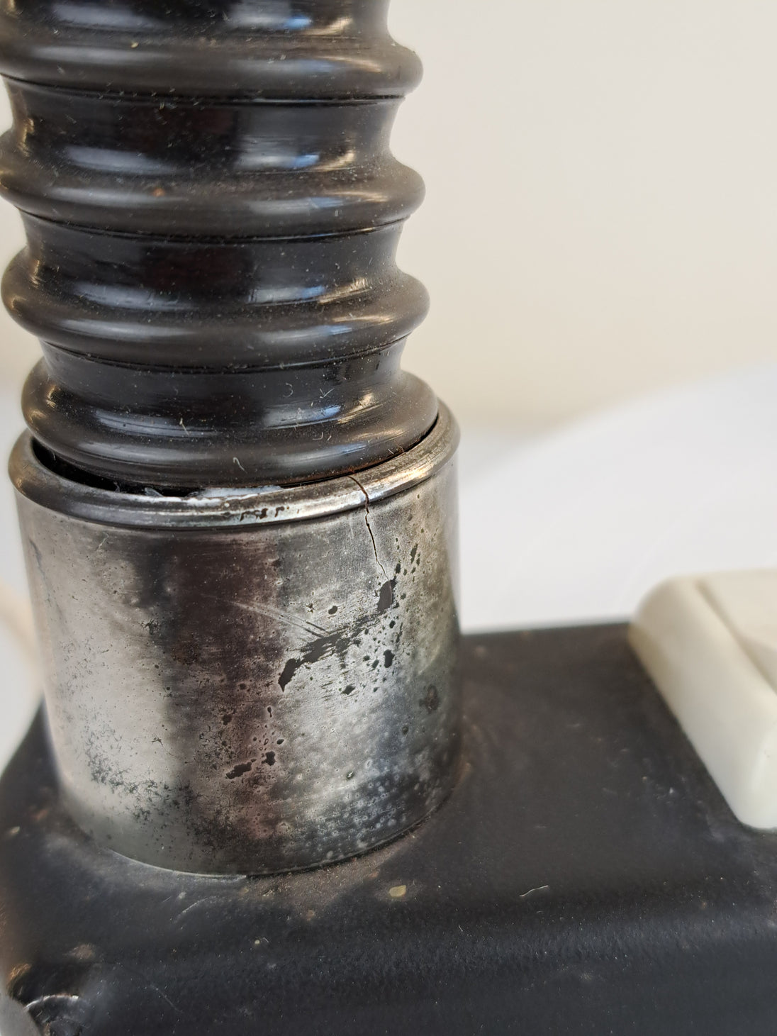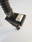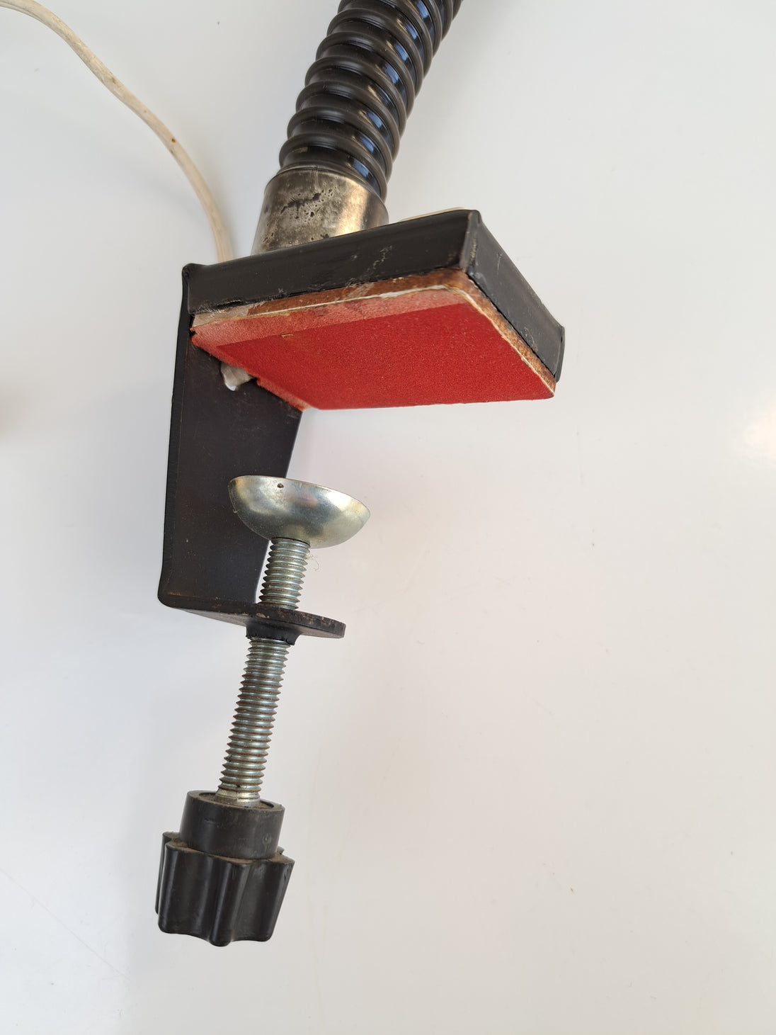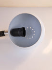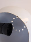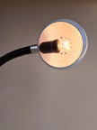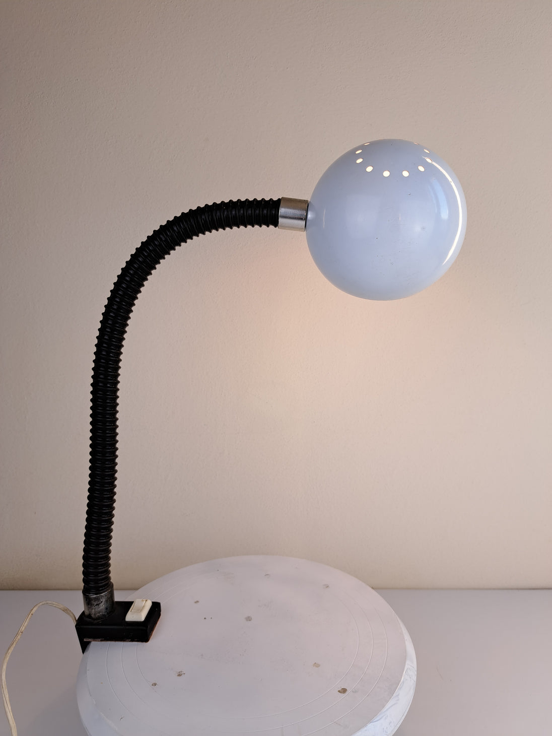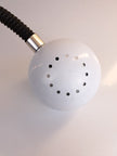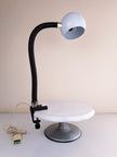 Lampada da scrivania a morsetto in metallo e plastica bianca e nera con collo snodabile, produzione italiana anni '60. Caratterizzata da paralume sferico in metallo smaltato bianco, collo flessibile e morsetto in metallo con pulsante d'accensione. Buone condizioni generali con segni di utilizzo e del tempo, nessun marchio presente. Attacco portalampada E27.