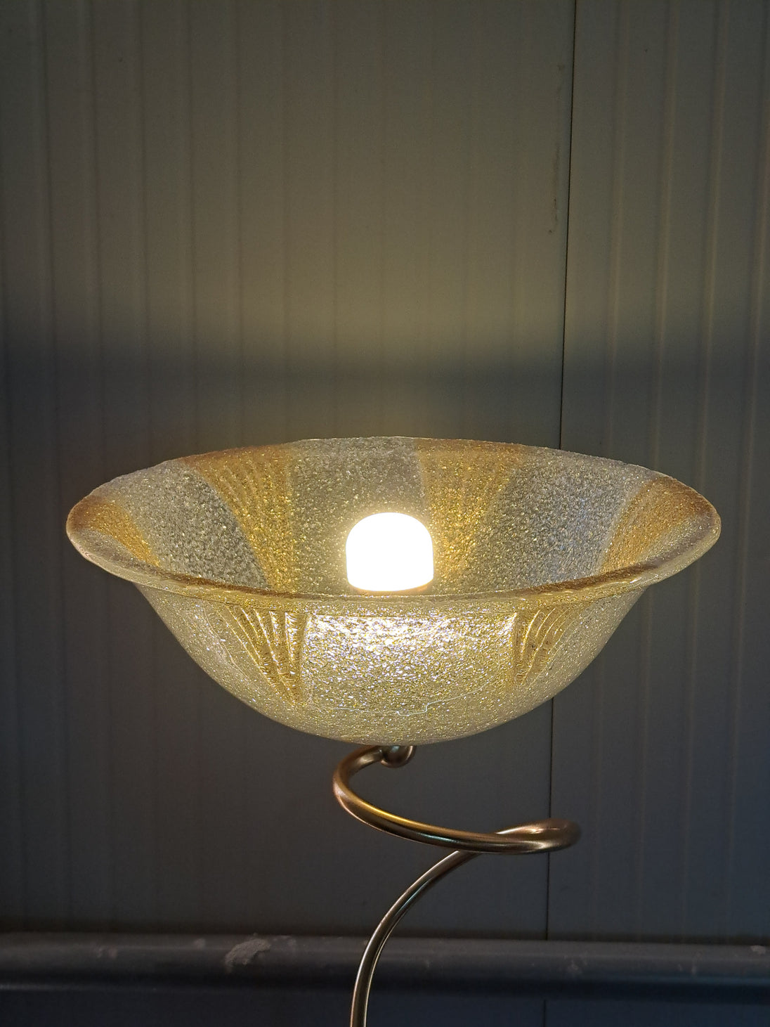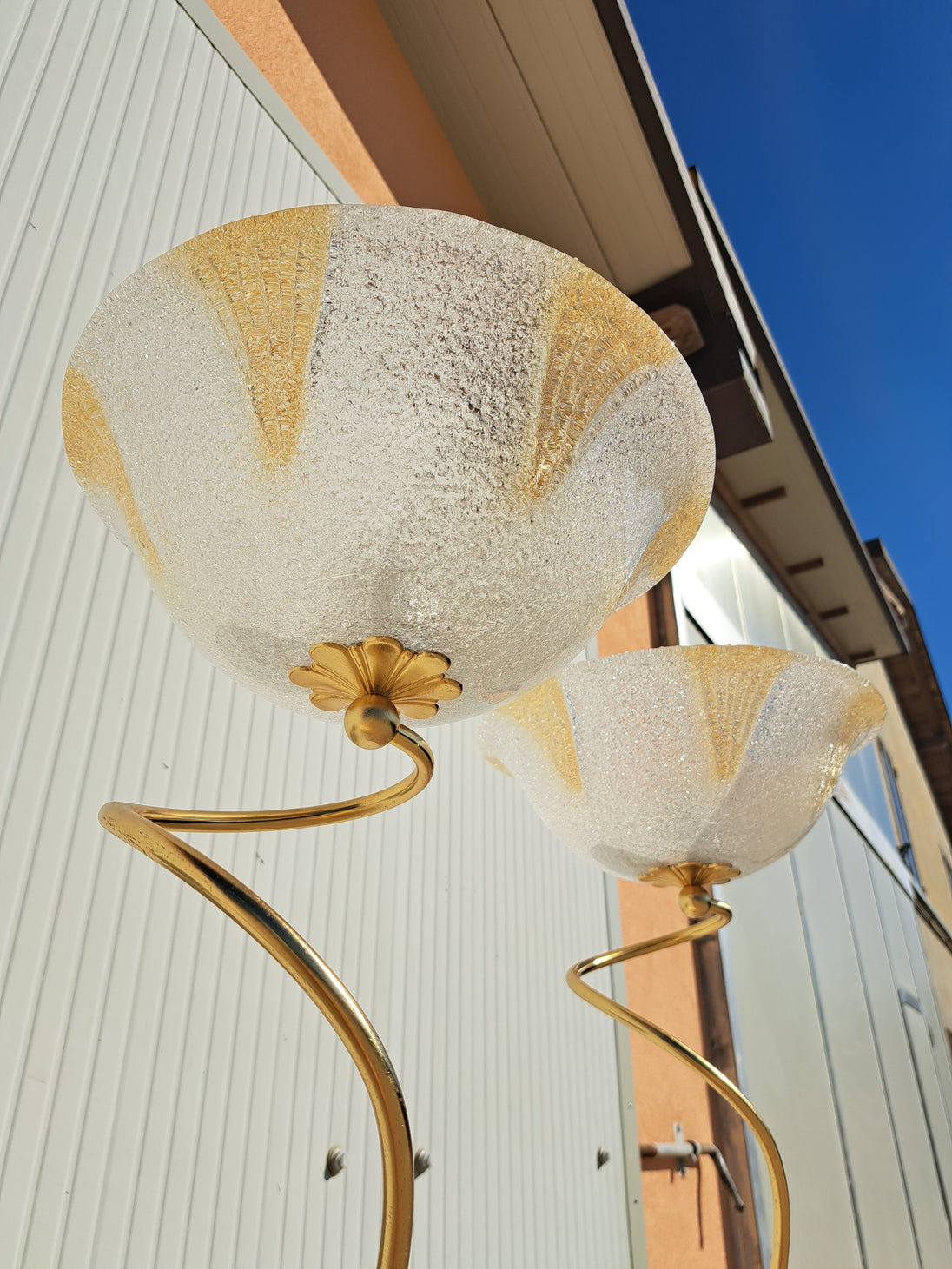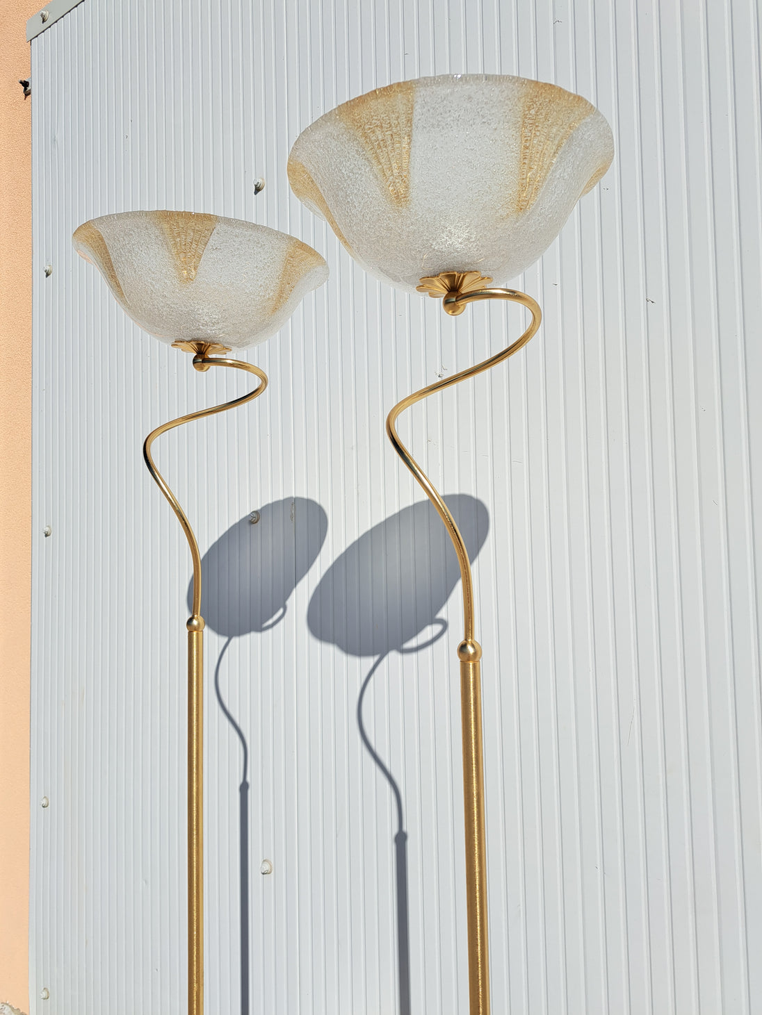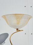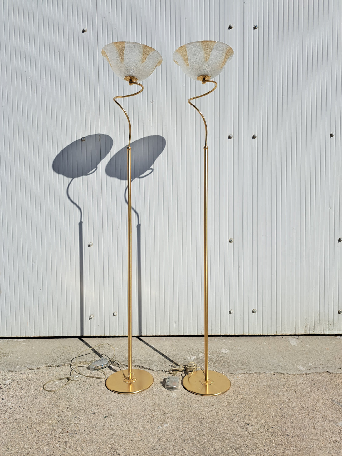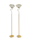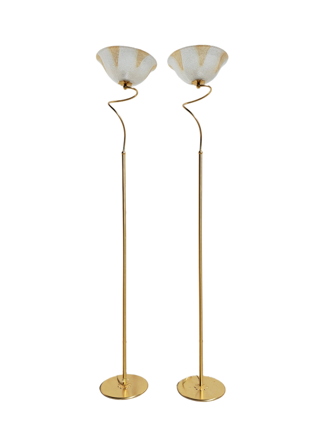 Coppia di lampade a piantana con base e stelo in metallo dorato e paralume in vetro, anni 90. Queste eleganti lampade da terra di gusto classico sono formate da una base circolare, un lungo stelo che si arriccia a spirale nella parte alta e un paralume a semisfera in vetro graniglia trasparente con decori triangolari dorati. Buone condizioni generali si evidenziano alcuni segni di utilizzo e del tempo sulle basi metalliche. Attacco portalampada E27.