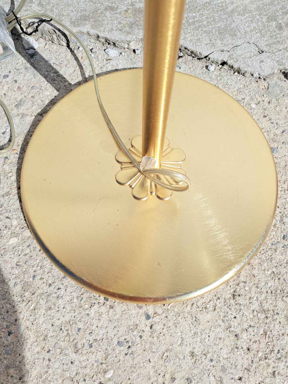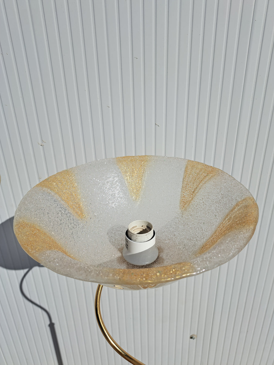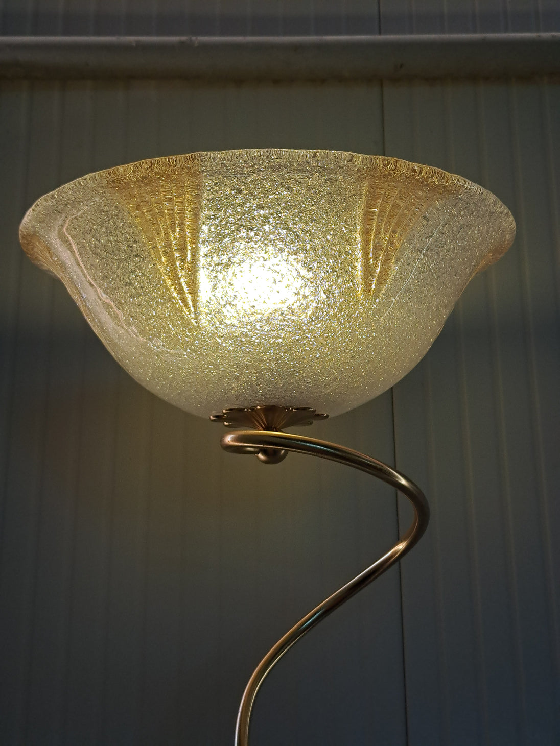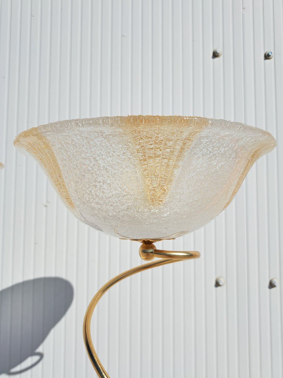 Coppia di lampade a piantana con base e stelo in metallo dorato e paralume in vetro, anni 90. Queste eleganti lampade da terra di gusto classico sono formate da una base circolare, un lungo stelo che si arriccia a spirale nella parte alta e un paralume a semisfera in vetro graniglia trasparente con decori triangolari dorati. Buone condizioni generali si evidenziano alcuni segni di utilizzo e del tempo sulle basi metalliche. Attacco portalampada E27.