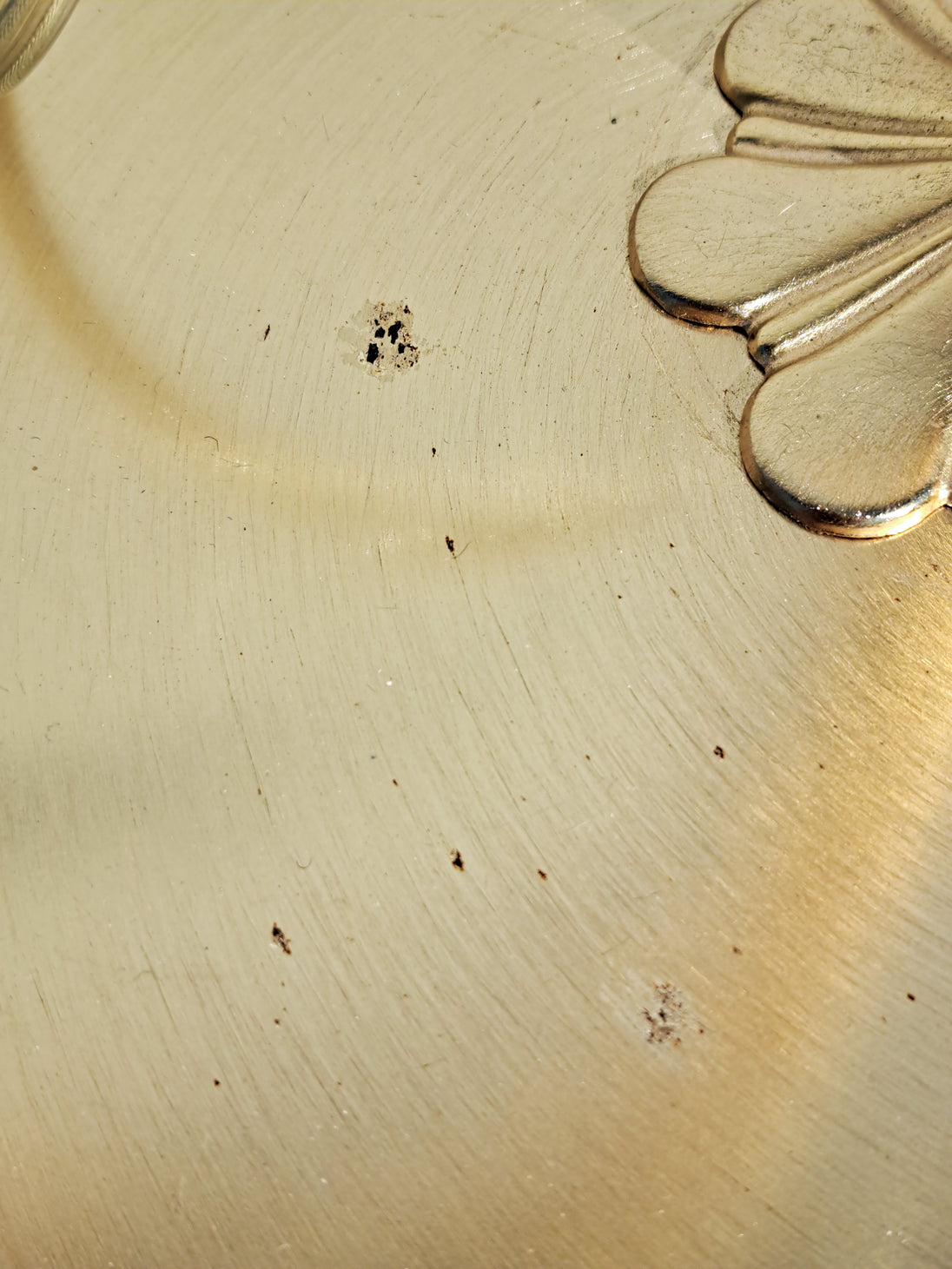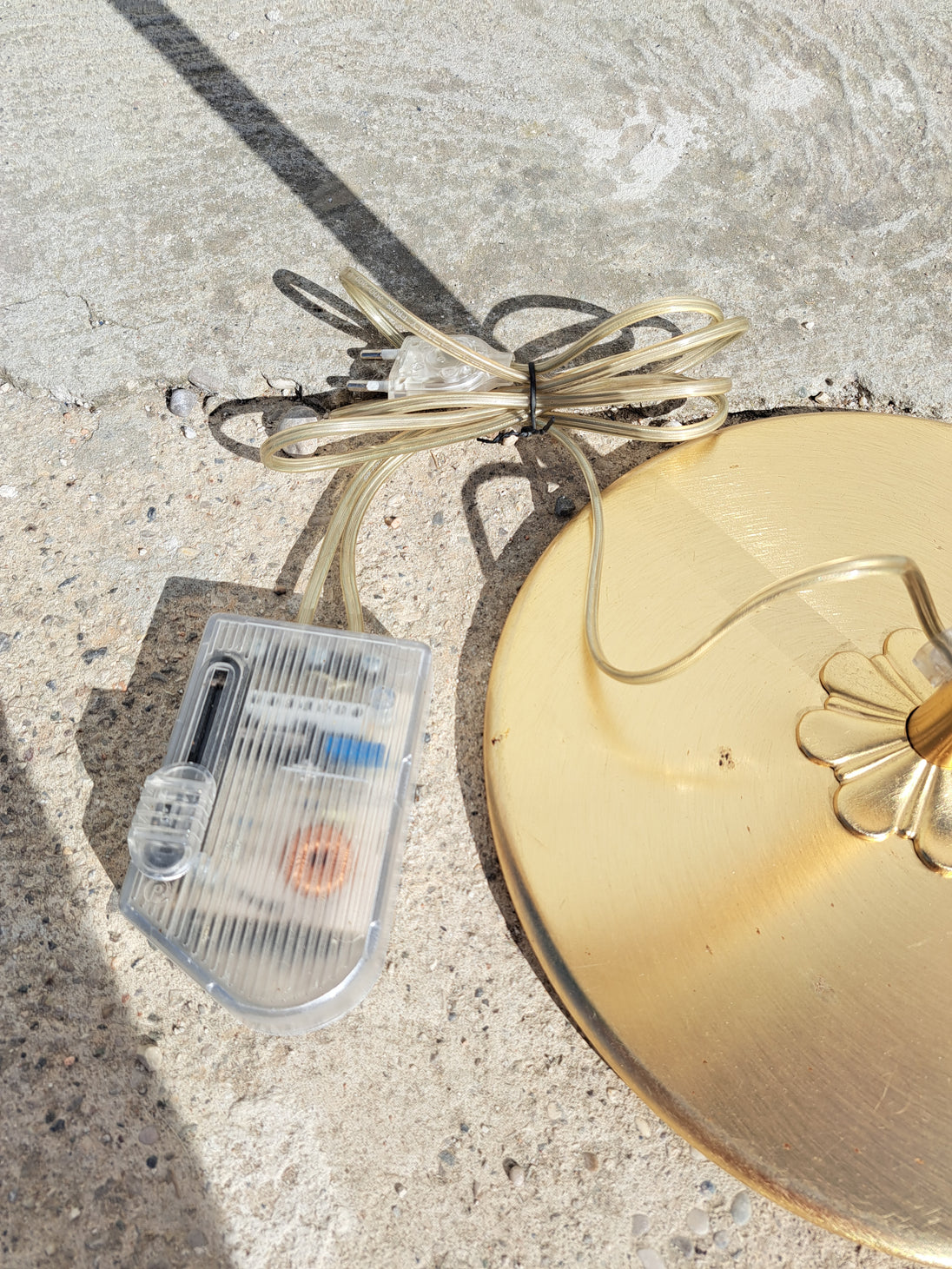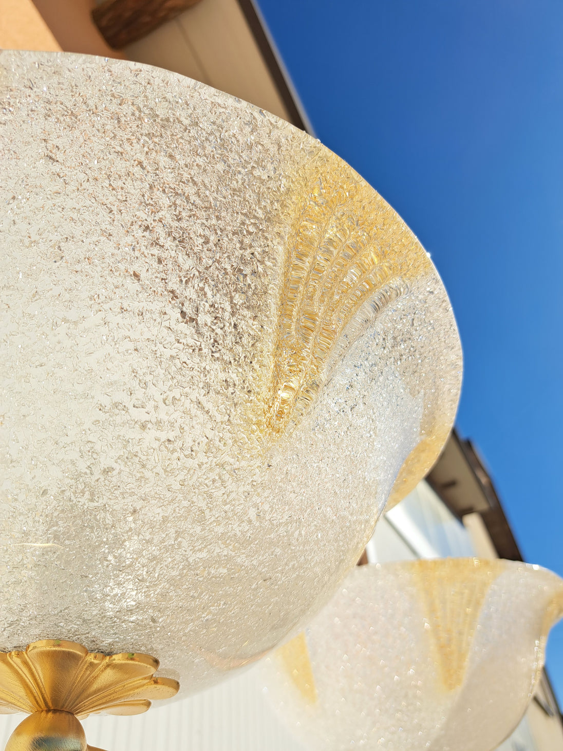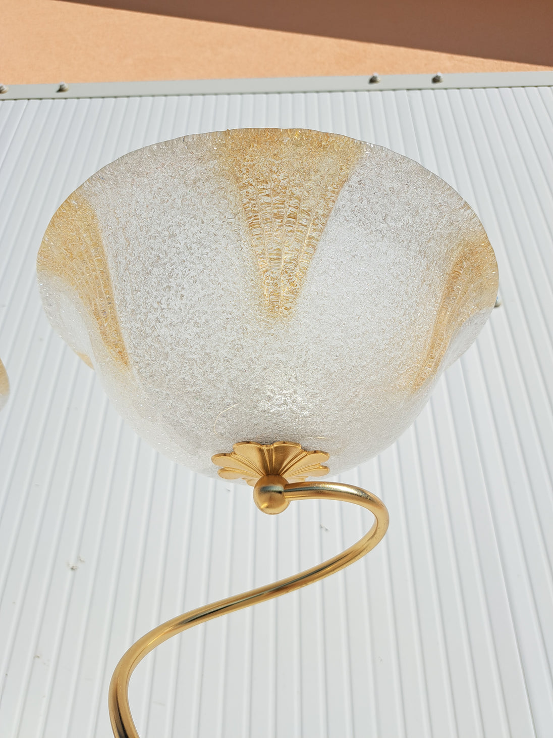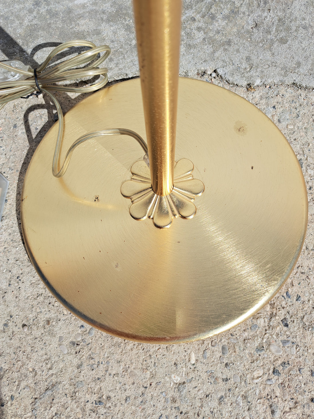 Coppia di lampade a piantana con base e stelo in metallo dorato e paralume in vetro, anni 90. Queste eleganti lampade da terra di gusto classico sono formate da una base circolare, un lungo stelo che si arriccia a spirale nella parte alta e un paralume a semisfera in vetro graniglia trasparente con decori triangolari dorati. Buone condizioni generali si evidenziano alcuni segni di utilizzo e del tempo sulle basi metalliche. Attacco portalampada E27.