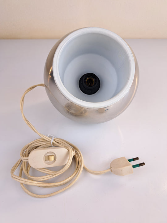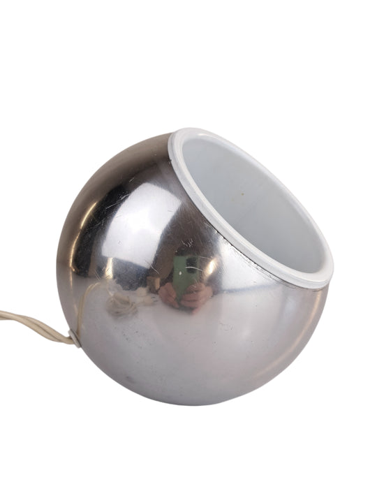Lampada da appoggio in metallo cromato e verniciato bianco, orientabile e posizionabile a piacimento e senza base ma con all'interno della scocca tante piccole sfere metalliche che servono a stabilizzare la posizione della lampada. produzione anni...Prezzo di listino €50,00 -