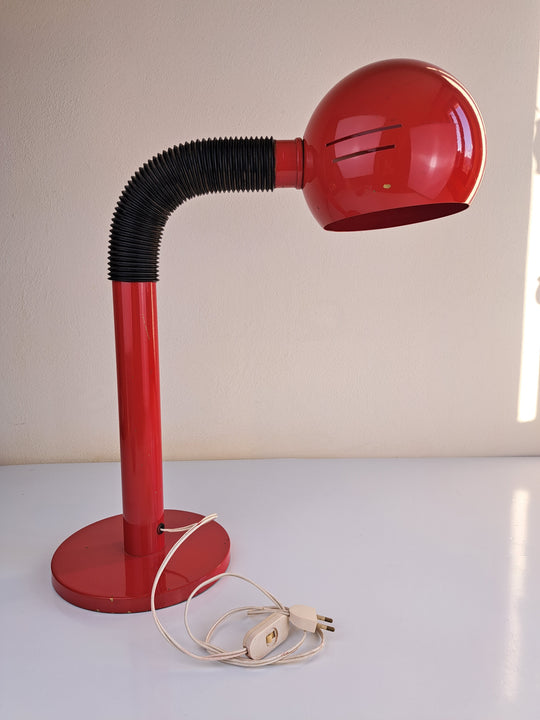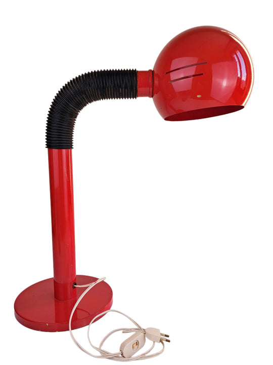 Grande lampada in metallo verniciato rosso e plastica nera, attribuibile al marchio italiano Zonca, modernariato anni '70. Una lampada in stile space age dal design massiccio (circa 6,5 kg di peso) con collo snodabile per orientarla...Prezzo di listino €160,00 -