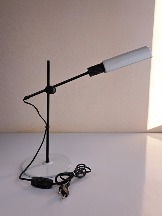 Lampada da scrivania in metallo bianco e nero, modello Z1-90 prodotta negli anni '80 da Nuova Veneta Lumi. Lampada orientabile formata da una base rotonda con asta verticale fissa a cui è ancorato una seconda asta...Prezzo di listino €70,00 -