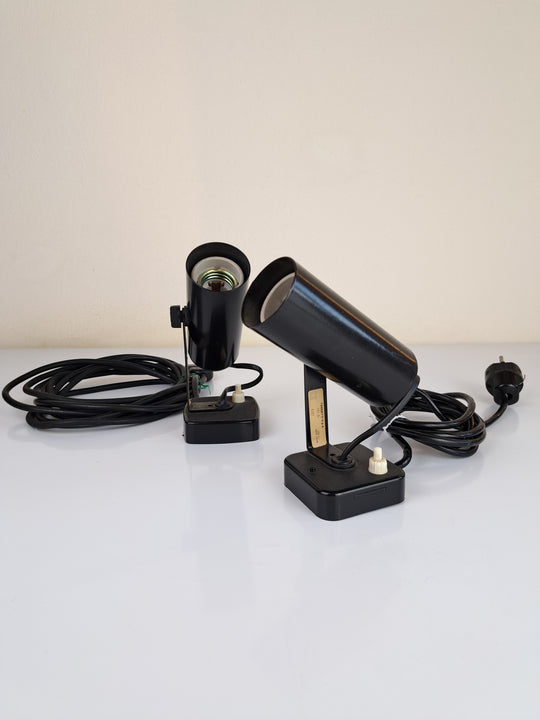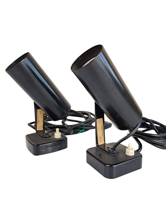 Coppia di lampade da parete in metallo e plastica nera, design Targetti anni 70. 2 faretti orientabili con etichetta originale, due modelli diversi ma similari che differiscono per la ghiera di regolazione laterale, gli attacchi alla...Prezzo di listino €40,00 -