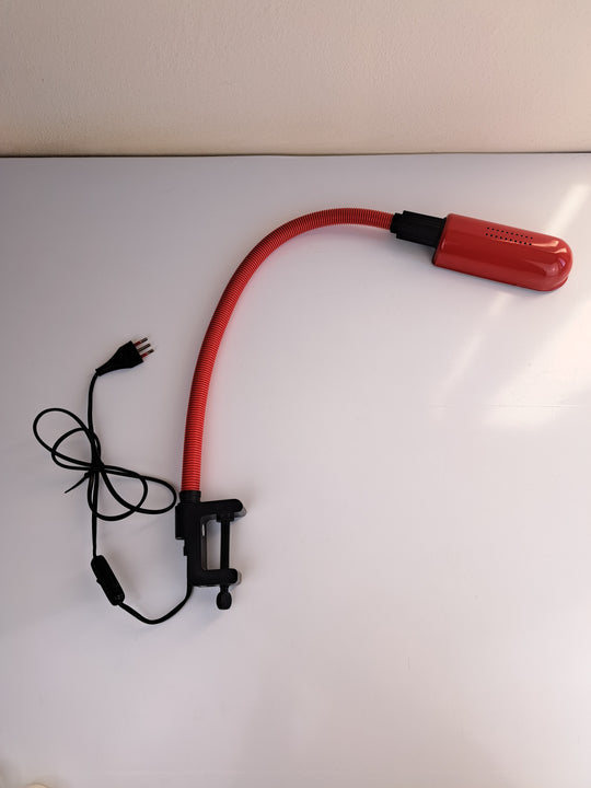 Lampada da scrivania a morsetto in metallo e plastica rossa e nera con collo snodabile, prodotta negli anni '80 dall'azienda italiana Stilplast, articolo 3601. Utile da agganciare al bordo della propria scrivania o su una mensola...Prezzo di listino €35,00 -