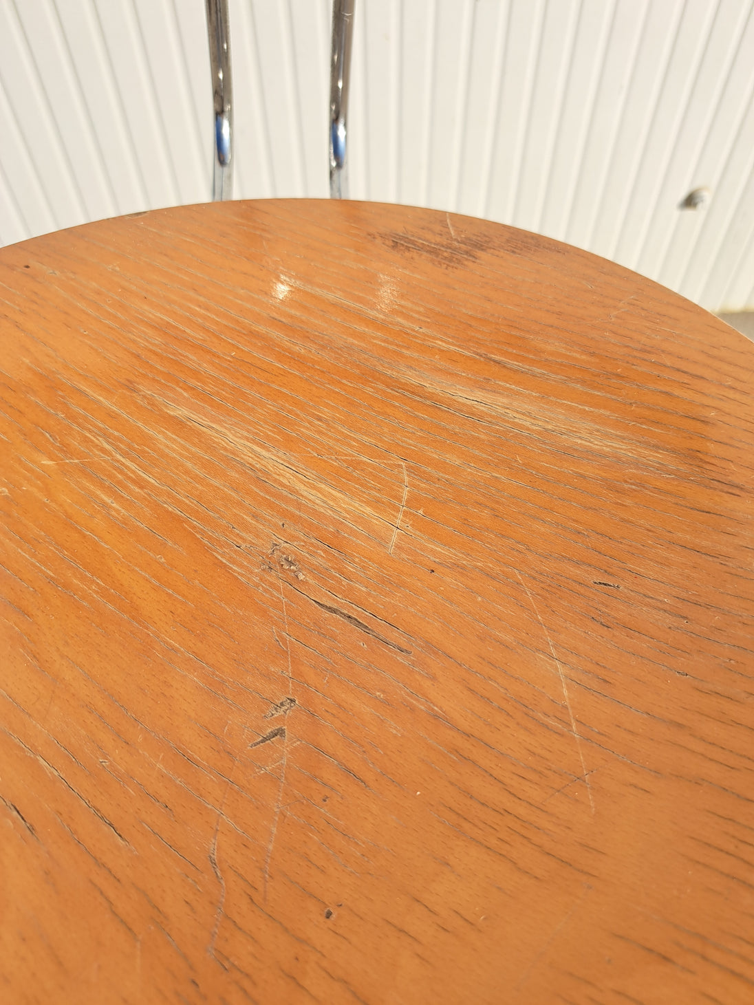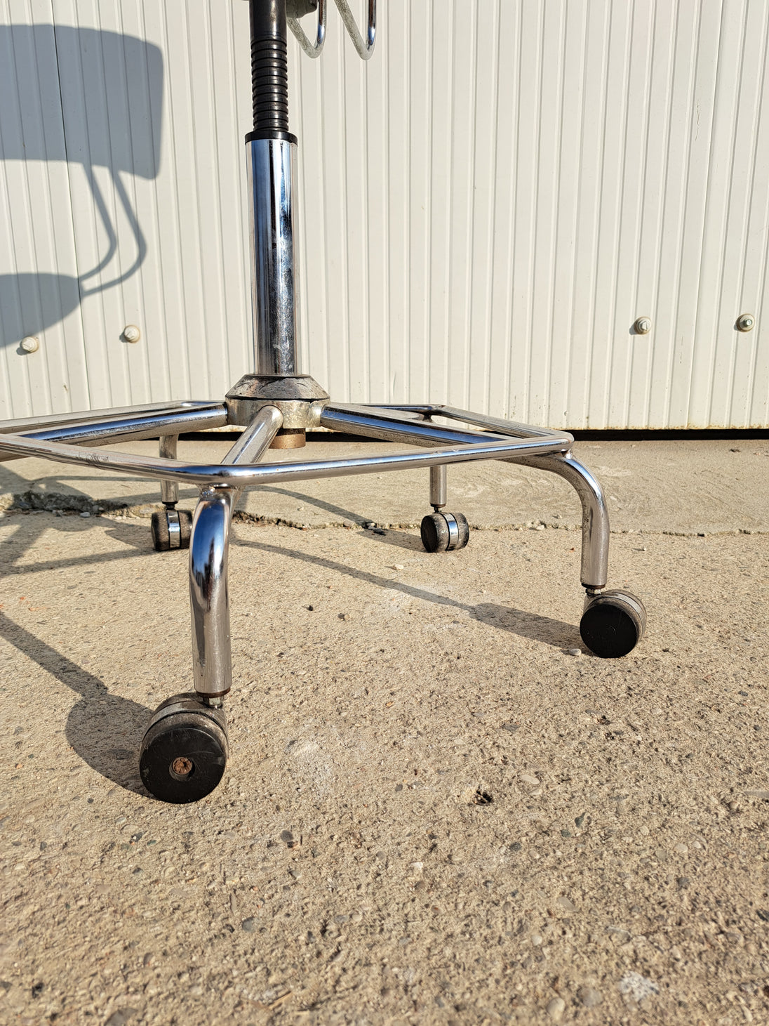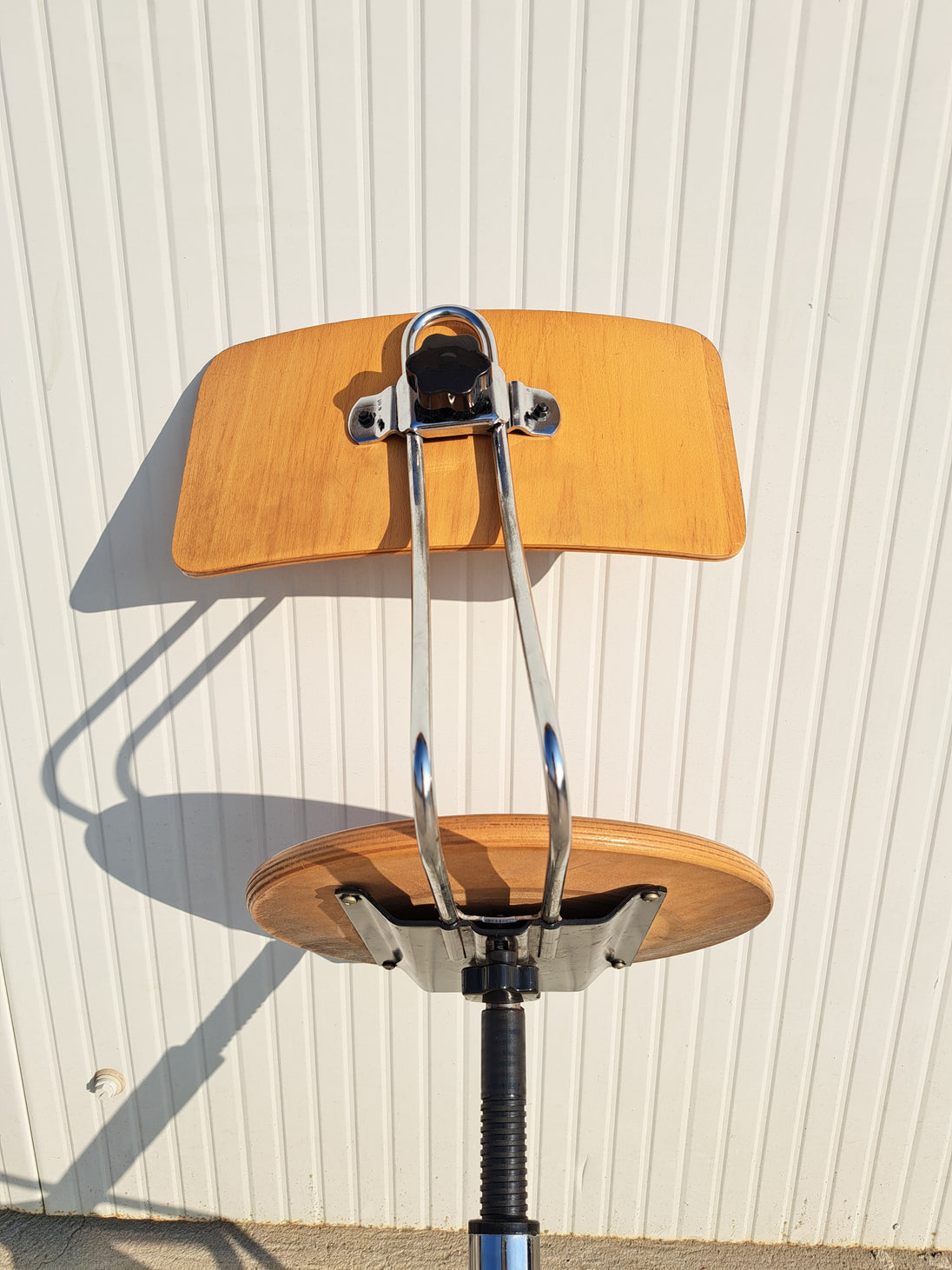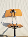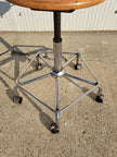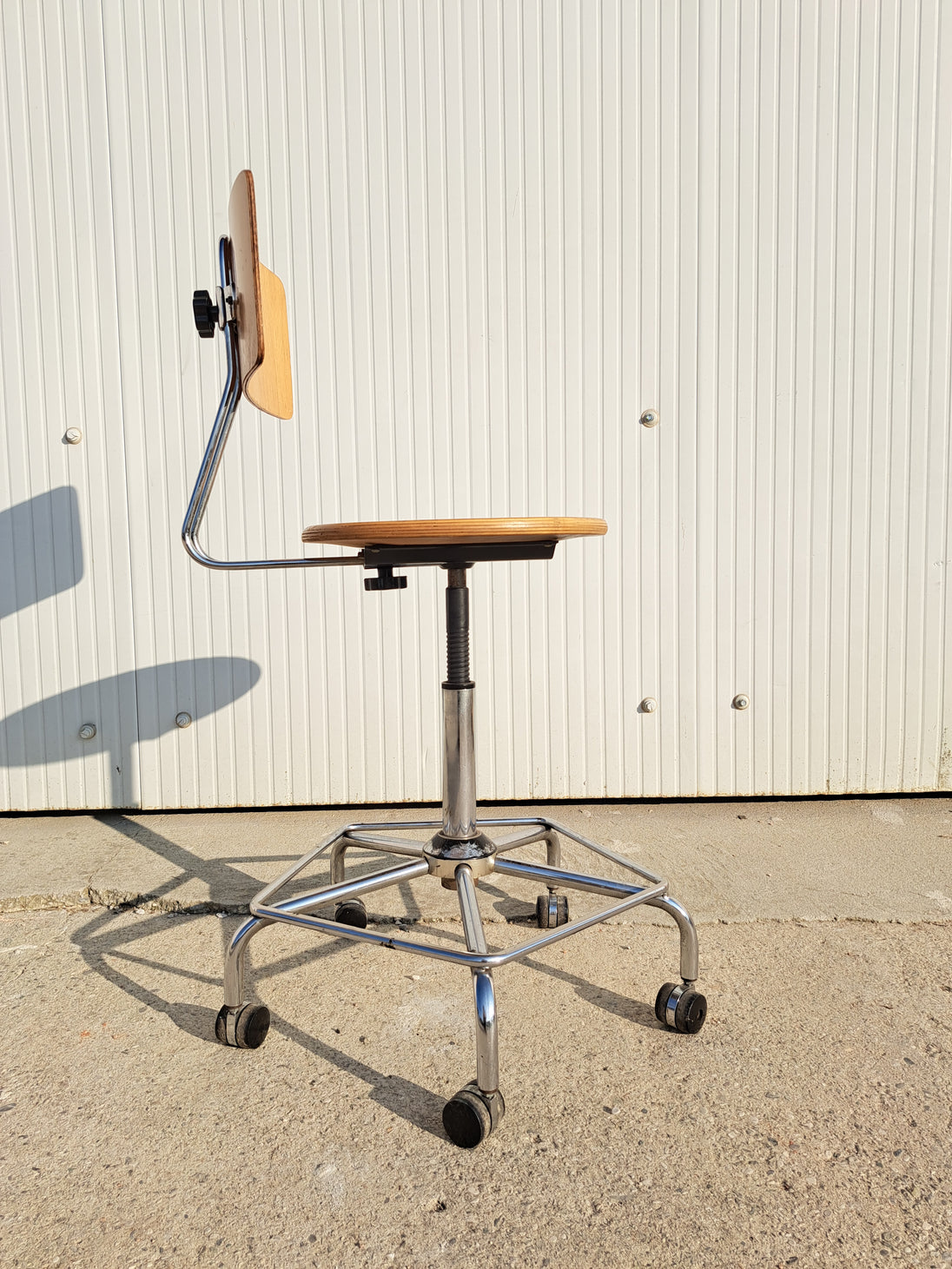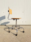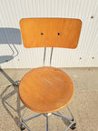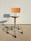 Sgabello industriale alto con struttura in metallo cromato, seduta e schienale regolabile in legno, 5 rotelle e poggia piedi. Sgabello da lavoro stabile e funzionale, altezza e profondità dello schienale regolabili così come l'altezza della seduta girevole con meccanismo a vite. Pensato per adattarsi alle esigenze di chi lo usa, si muove in modo scorrevole e si regola con facilità. Buone condizioni generali con segni dell'età e di utilizzo, schienale leggermente inclinato fuori asse. Produzione anni 80 circa.