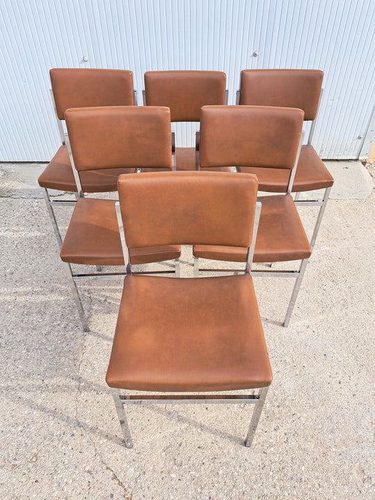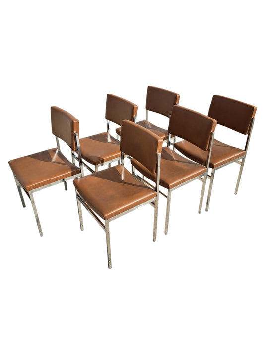 Set di 6 sedie in pelle marrone e struttura in metallo cromato, produzione anni 70. Comodità e semplicità per queste sedie dalla linea pulita abbinabili ad un tavolo vintage o moderno, grazie ai toni caldi del...Prezzo di listino €200,00 -
