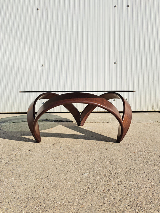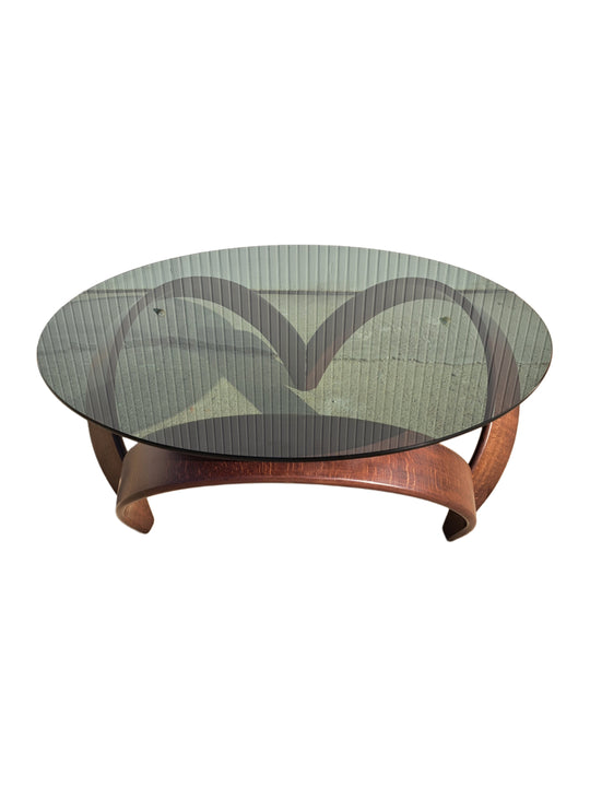 Tavolo rotondo basso da salotto attribuibile al modello Soquel prodotto dall'azienda Olandese Eichholtz. Tavolino da caffè con piano in vetro fumè e 3 zampe in legno sagomate ad arco e unite tra loro come un nastro continuo....Prezzo di listino €250,00 -