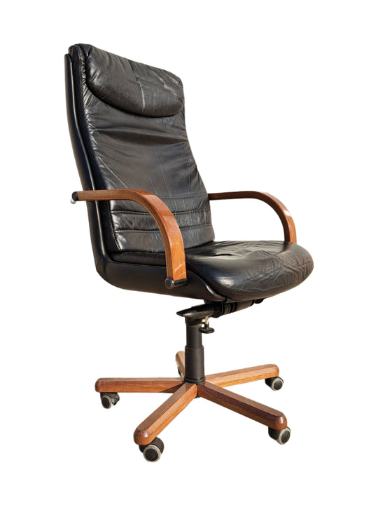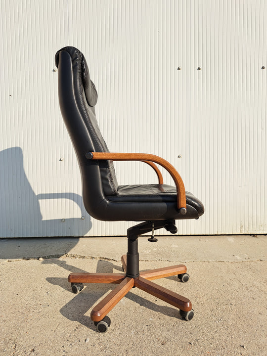 Elegante e comoda poltrona da scrivania imbottita e rivestita in pelle nera con braccioli e piedi in legno. Poltrona girevole su rotelle con altezza regolabile e schienale a doppia modalità: fissa con schienale rigido o oscillante...Prezzo di listino €120,00