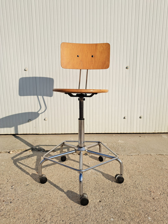 Sgabello industriale alto con struttura in metallo cromato, seduta e schienale regolabile in legno, 5 rotelle e poggia piedi. Sgabello da lavoro stabile e funzionale, altezza e profondità dello schienale regolabili così come l'altezza della seduta...Prezzo di listino €80,00 -