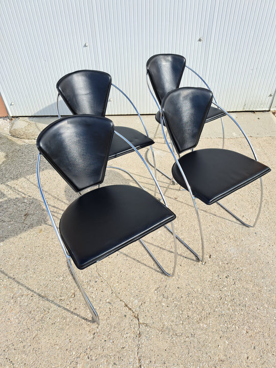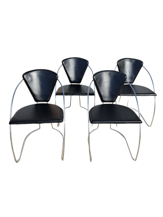 Set di 4 sedie modello Linda prodotte da Arrben negli anni '80. Struttura in tubolare di acciaio con seduta e schienale imbottiti e rivestiti in pelle nera. Design italiano postmoderno, una linea elegante e ricercata per...Prezzo di listino €250,00 -