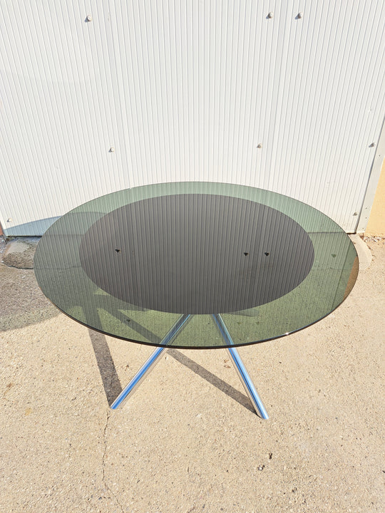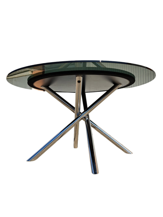 Tavolo rotondo disegnato negli anni 70 da Carlo Bartoli per Tisettanta. E' formato da 4 zampe in tubolare metallico cromato disposte incrociate tra loro (da qui il rimando al nome del modello Nodo), piano in legno...Prezzo di listino €450,00 -