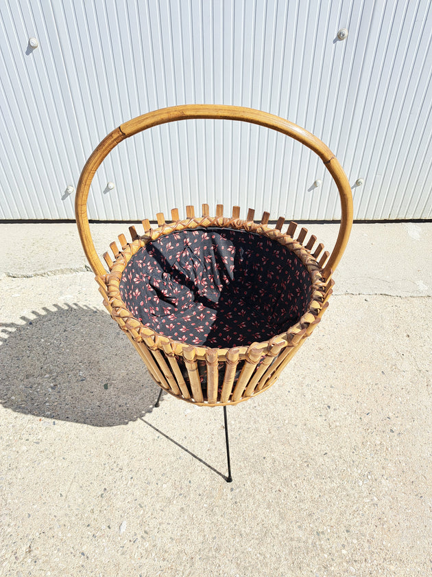 Portariviste anni 50 con struttura in ferro e listelli di legno. Presenta un manico con volute decorative in ferro e 4 piedini con terminali in gomma per salvaguardare il pavimento, i listelli sono in legno naturale...Prezzo di listino €30,00 -