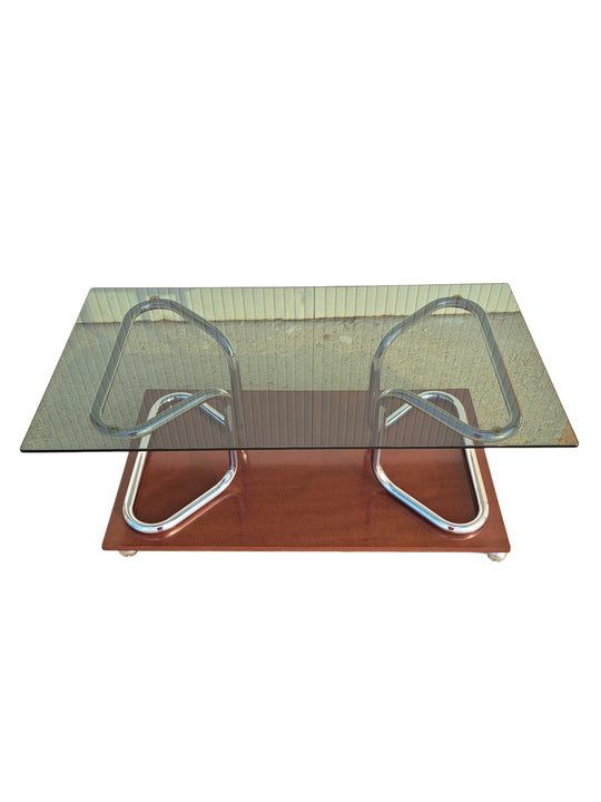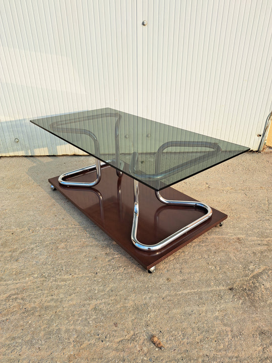 Tavolino basso su ruote con piano rettangolare in vetro fumè, zampe in tubolare metallico cromato e base in legno. Produzione italiana anni 70/80, buone condizioni generali con piccoli segni del tempo sulle componenti metalliche. Tavolino da...Prezzo di listino €80,00 -