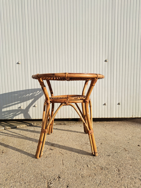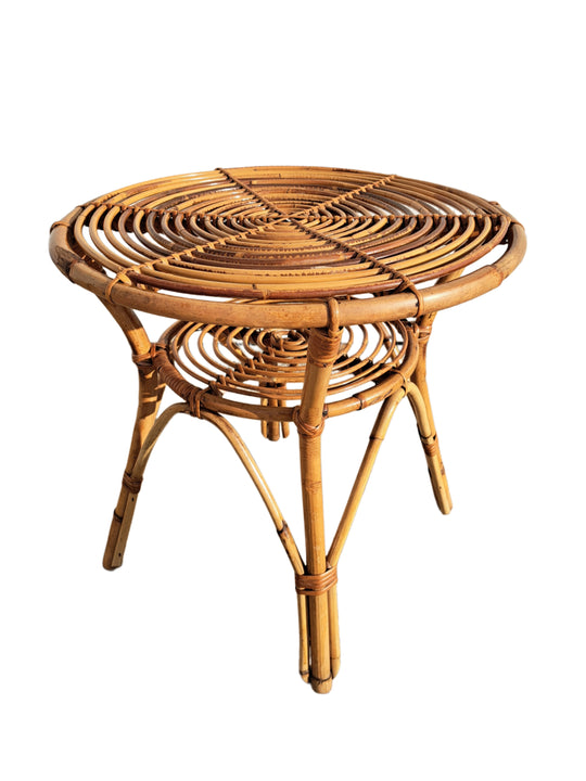 Piccolo tavolo di servizio in bambù e vimini intrecciato, produzione italiana anni 60. Forma rotonda con doppio piano di appoggio e 4 zampe. Adatto per l'interno o esterno coperto come una veranda o portico, compatto e...Prezzo di listino €40,00 -
