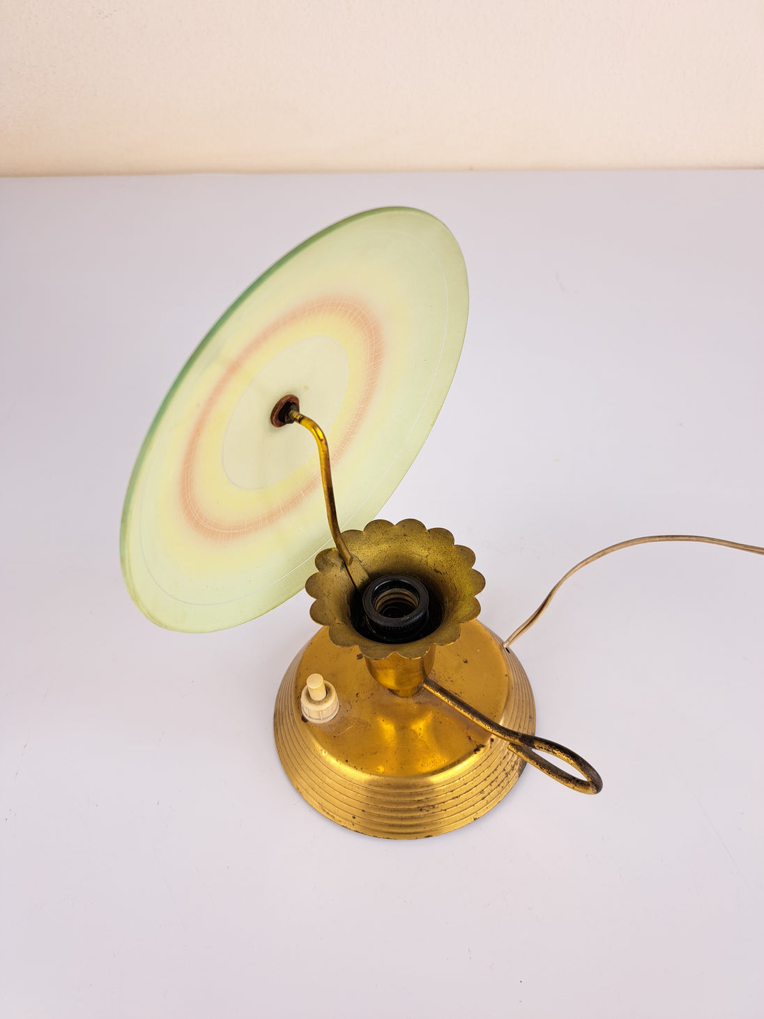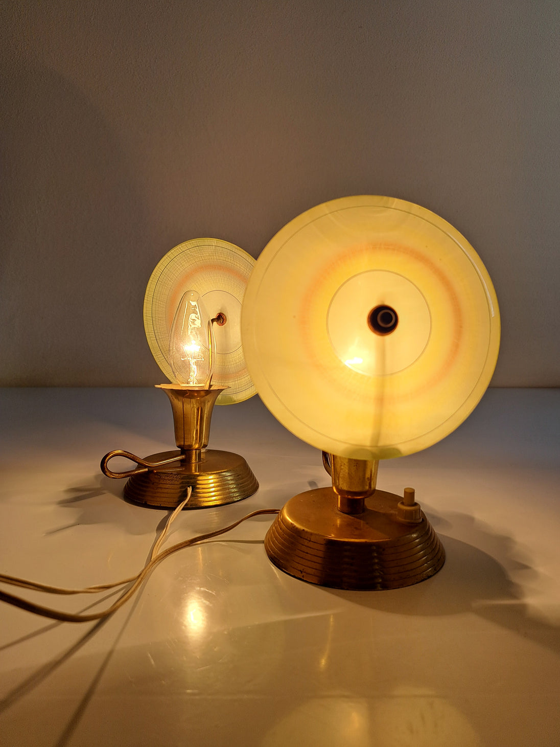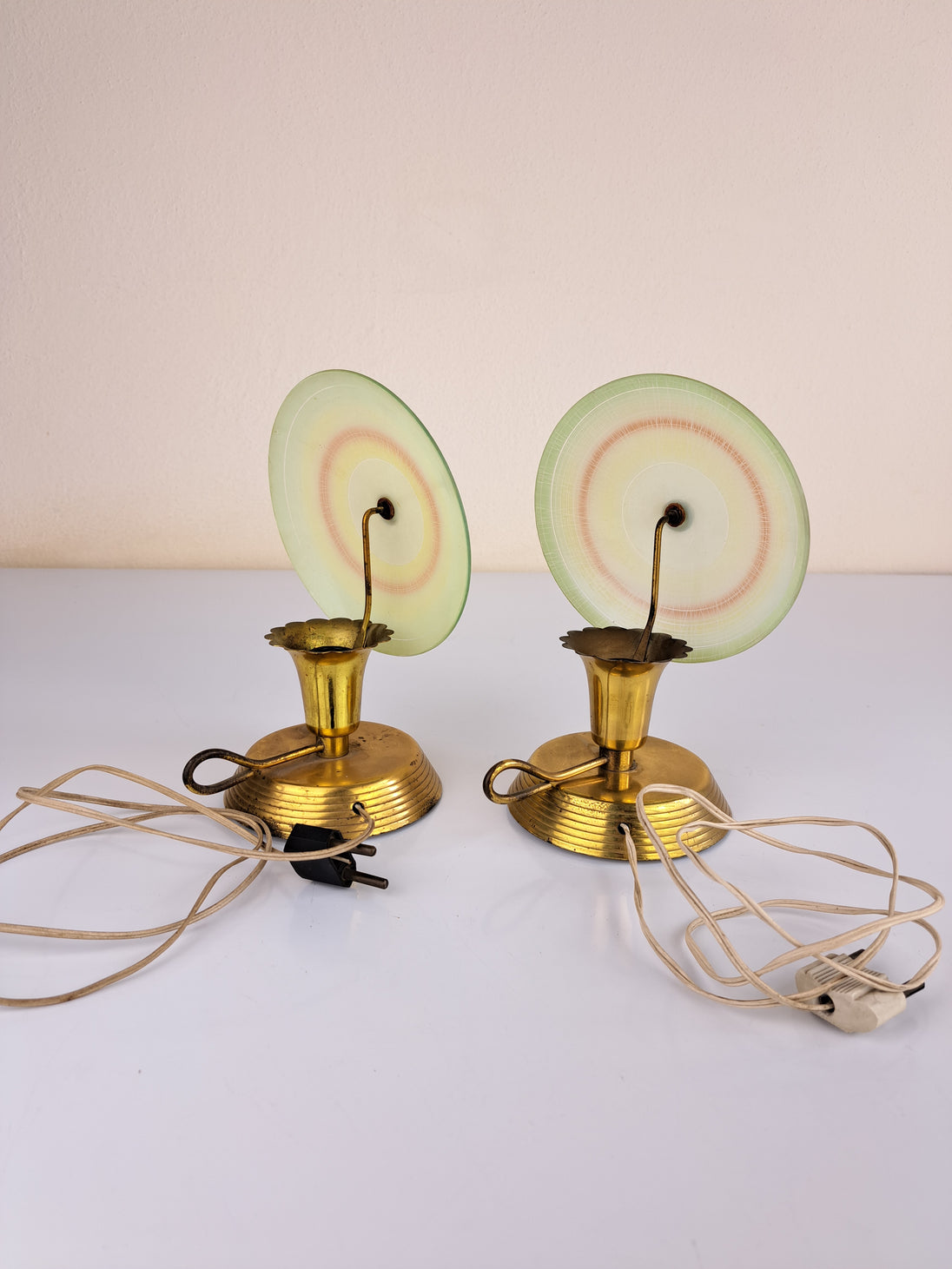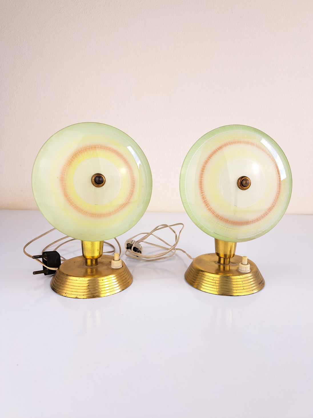 Piccole lampade da comodino in ottone e disco in vetro colorato, produzione anni 50. Lampade funzionanti con cavi e prese dell'epoca, attacco portalampada E14. Sono composte da una base in metallo dorato con un manico per essere spostate all'occorrenza come delle bugie, l'invito per la lampadina ha un bordo ondulato che si rifletterà sul piano quando le lampade saranno accese creando un elegante ombreggiatura a fiore, il paralume invece è un disco in vetro con sfumature verdi gialle e rosse. Buone condizioni generali con segni di utilizzo e dell'età.