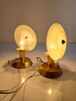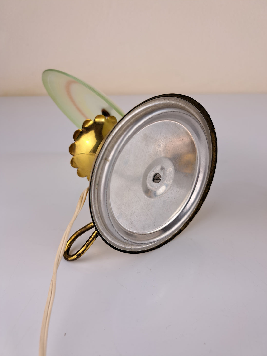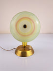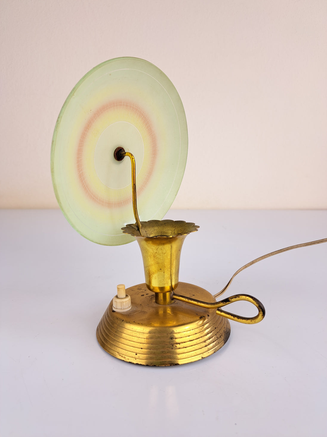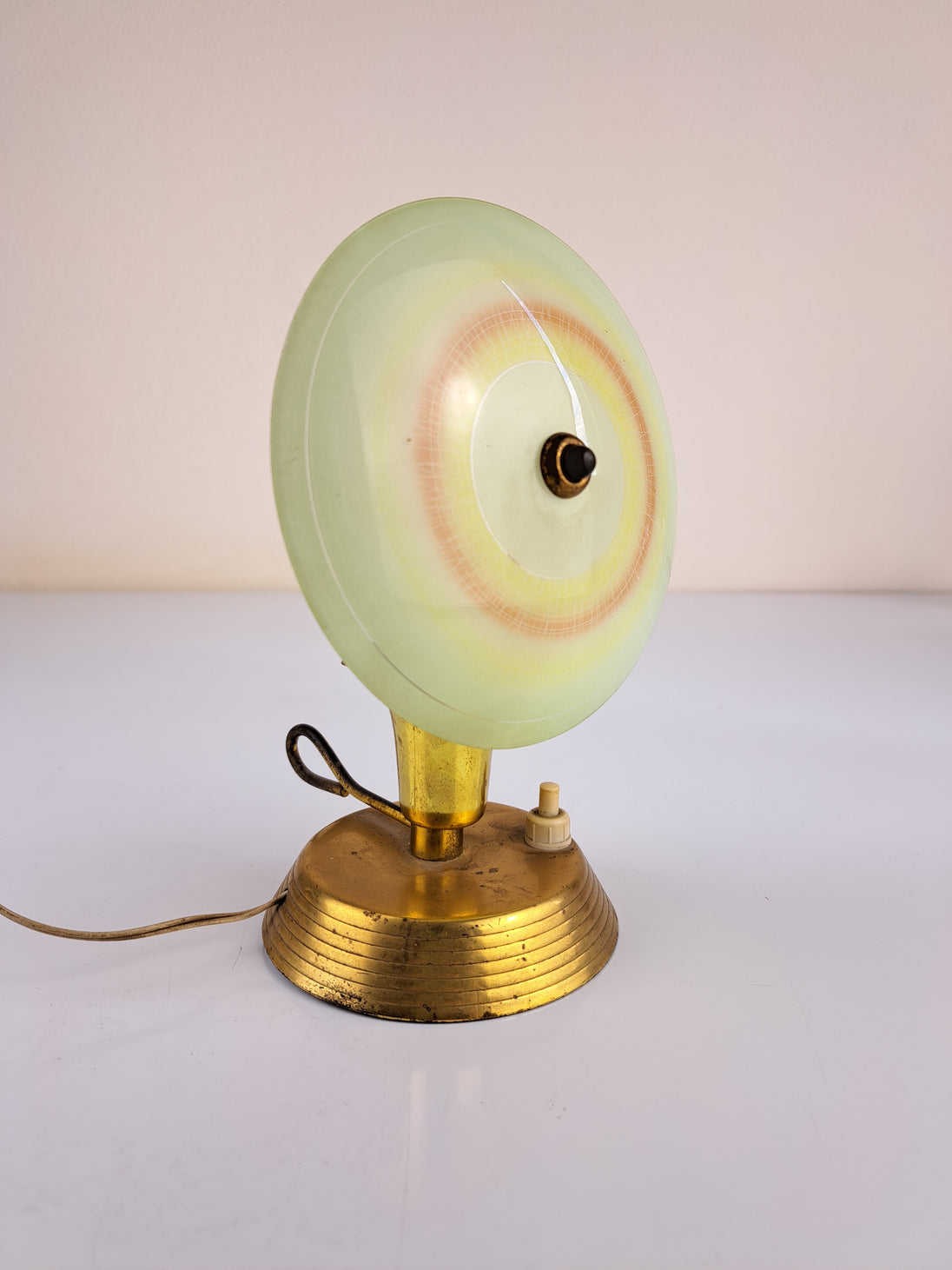 Piccole lampade da comodino in ottone e disco in vetro colorato, produzione anni 50. Lampade funzionanti con cavi e prese dell'epoca, attacco portalampada E14. Sono composte da una base in metallo dorato con un manico per essere spostate all'occorrenza come delle bugie, l'invito per la lampadina ha un bordo ondulato che si rifletterà sul piano quando le lampade saranno accese creando un elegante ombreggiatura a fiore, il paralume invece è un disco in vetro con sfumature verdi gialle e rosse. Buone condizioni generali con segni di utilizzo e dell'età.