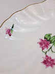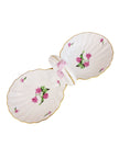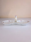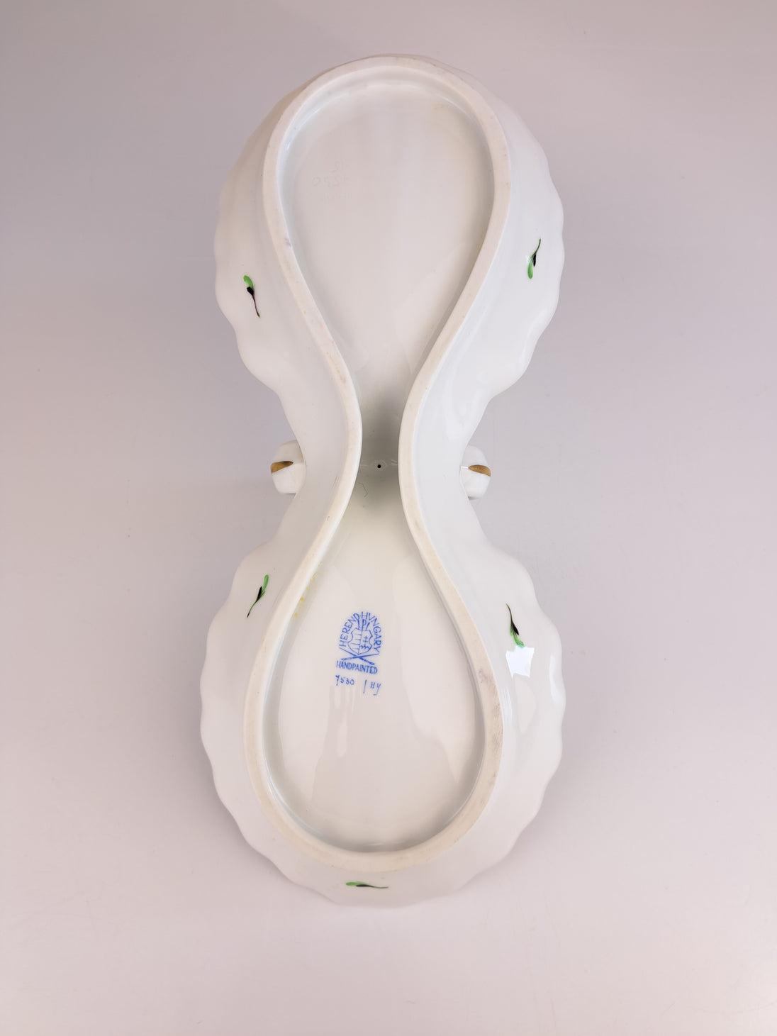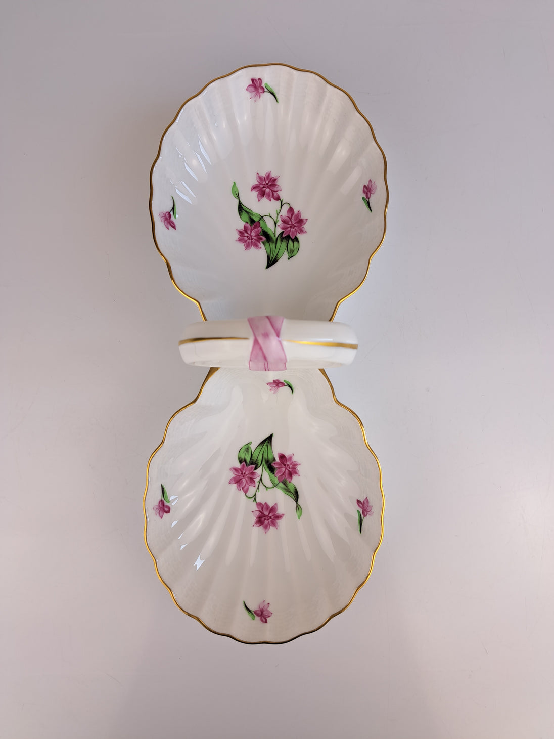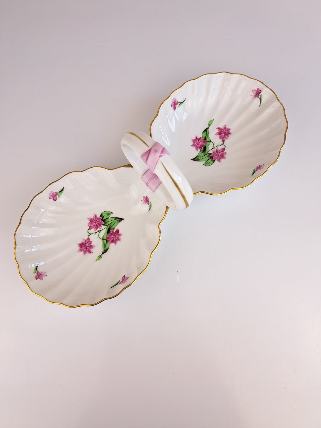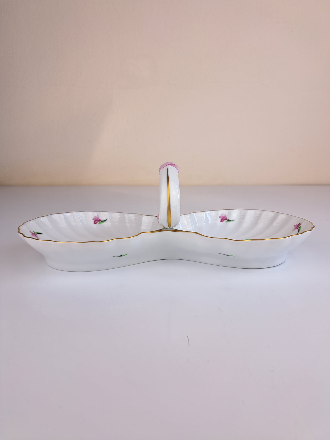 Antipastiera a due ciotole con forma a conchiglia, manico intrecciato, bordi dorati e decoro a fiori rosa. Marchiato e numerato sul fondo: ceramica Herend Hungary handpainted. Ottime condizioni generali.