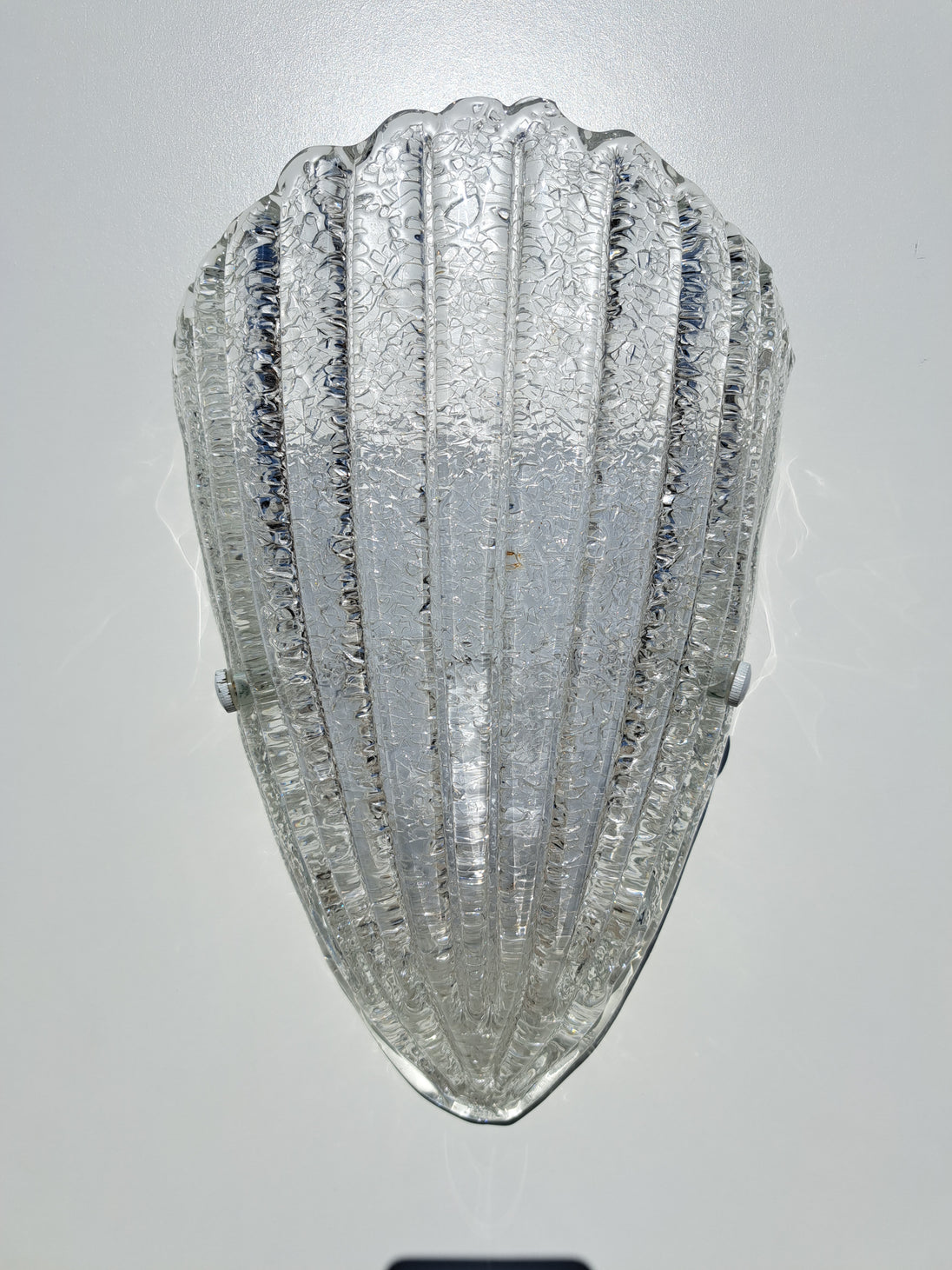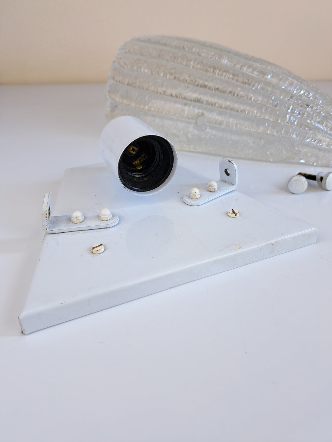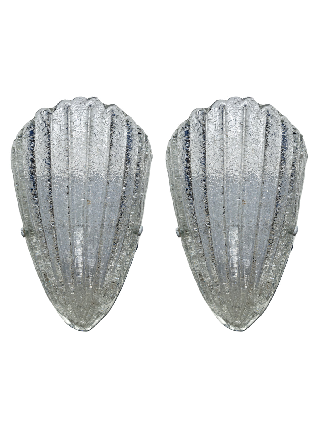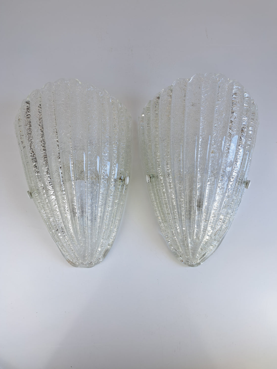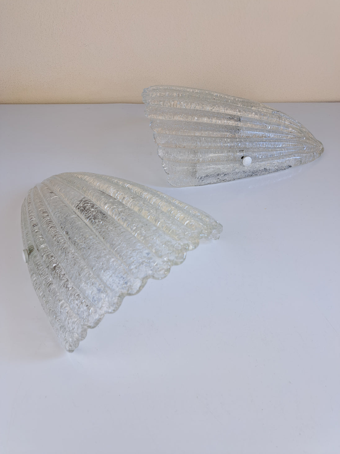 Coppia lampade da parete, produzione attribuibile alla lavorazione del vetro di Murano nello stile di Barovier & Toso, anni 70. Paralume in vetro graniglia a forma di scudo triangolare o conchiglia con scanalature e bordo superiore ondulato, attacchi in metallo verniciato bianco con portalampada E27. In base all'utilizzo di lampadine a luce calda o fredda cambierà anche l'effetto e la colorazione che assumeranno le lampade con le luci accese. Ottime condizioni generali.
