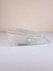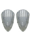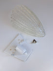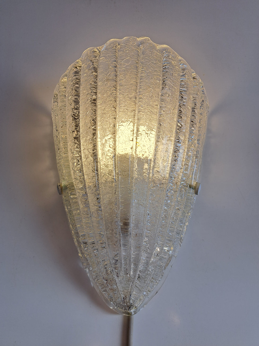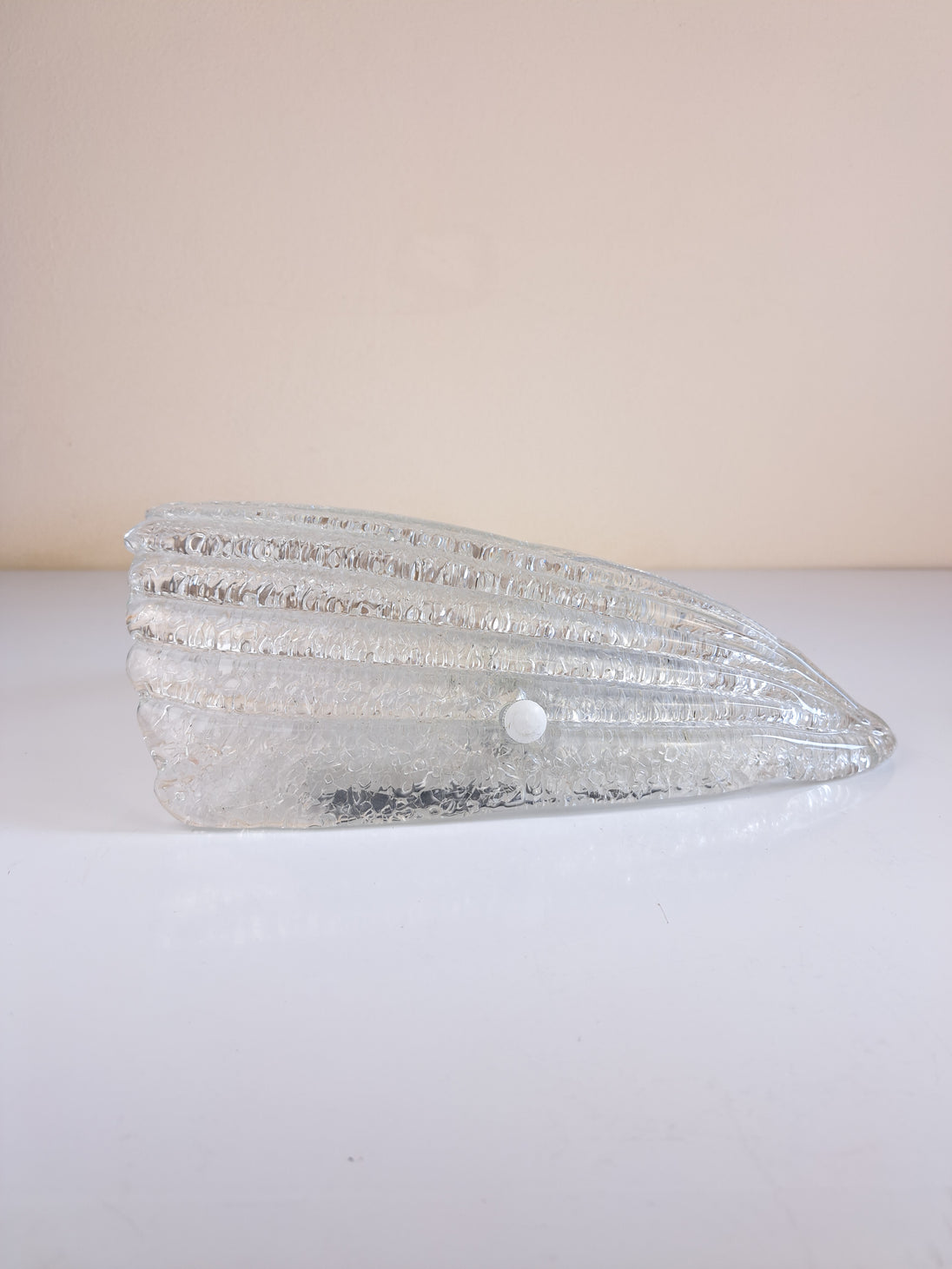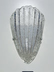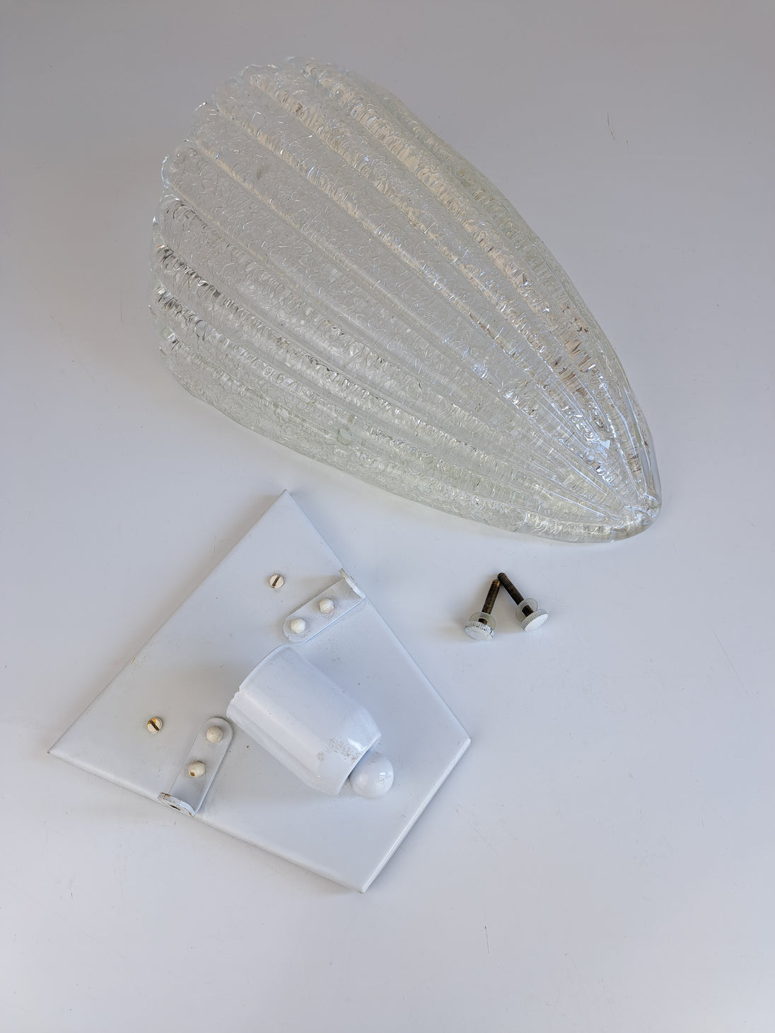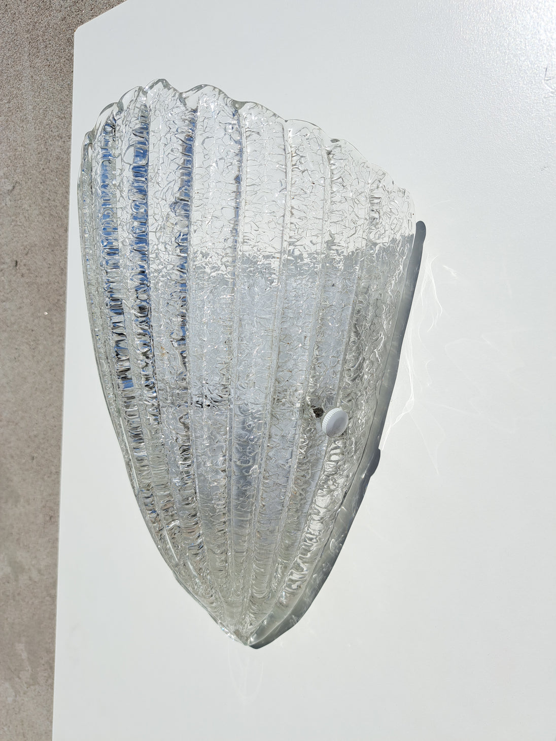 Coppia lampade da parete, produzione attribuibile alla lavorazione del vetro di Murano nello stile di Barovier & Toso, anni 70. Paralume in vetro graniglia a forma di scudo triangolare o conchiglia con scanalature e bordo superiore ondulato, attacchi in metallo verniciato bianco con portalampada E27. In base all'utilizzo di lampadine a luce calda o fredda cambierà anche l'effetto e la colorazione che assumeranno le lampade con le luci accese. Ottime condizioni generali.