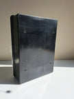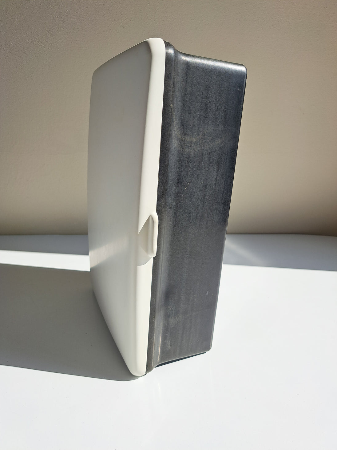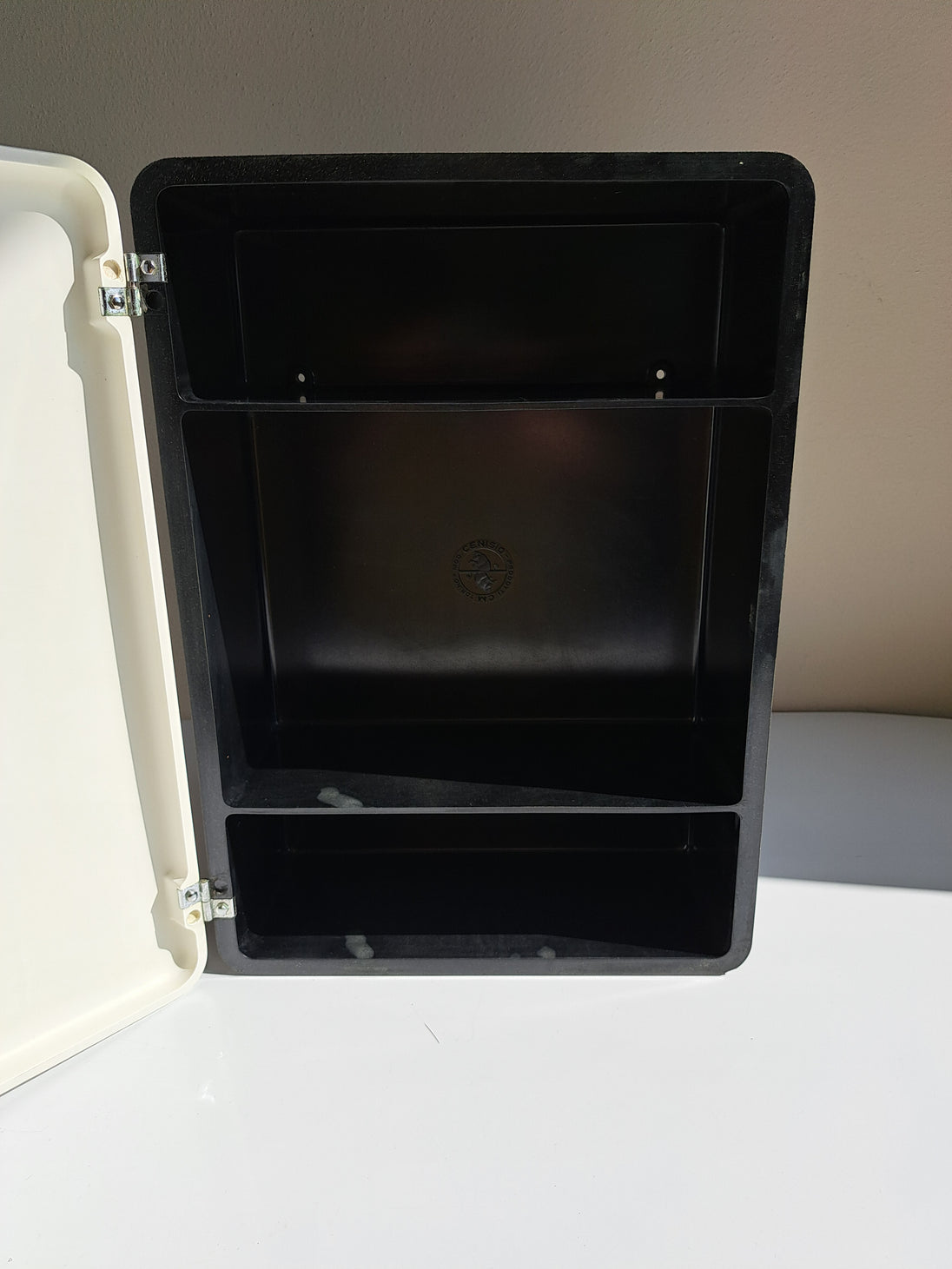 Mobiletto da bagno modello Cenisio prodotto da Carrara & Matta negli anni 60. Armadietto pensile in plastica bianca e nera a 1 anta con 3 scomparti interni. Discrete condizioni generali con segni del tempo e di utilizzo evidenti sulla plastica nera, riporta all'interno il marchio dell'azienda.