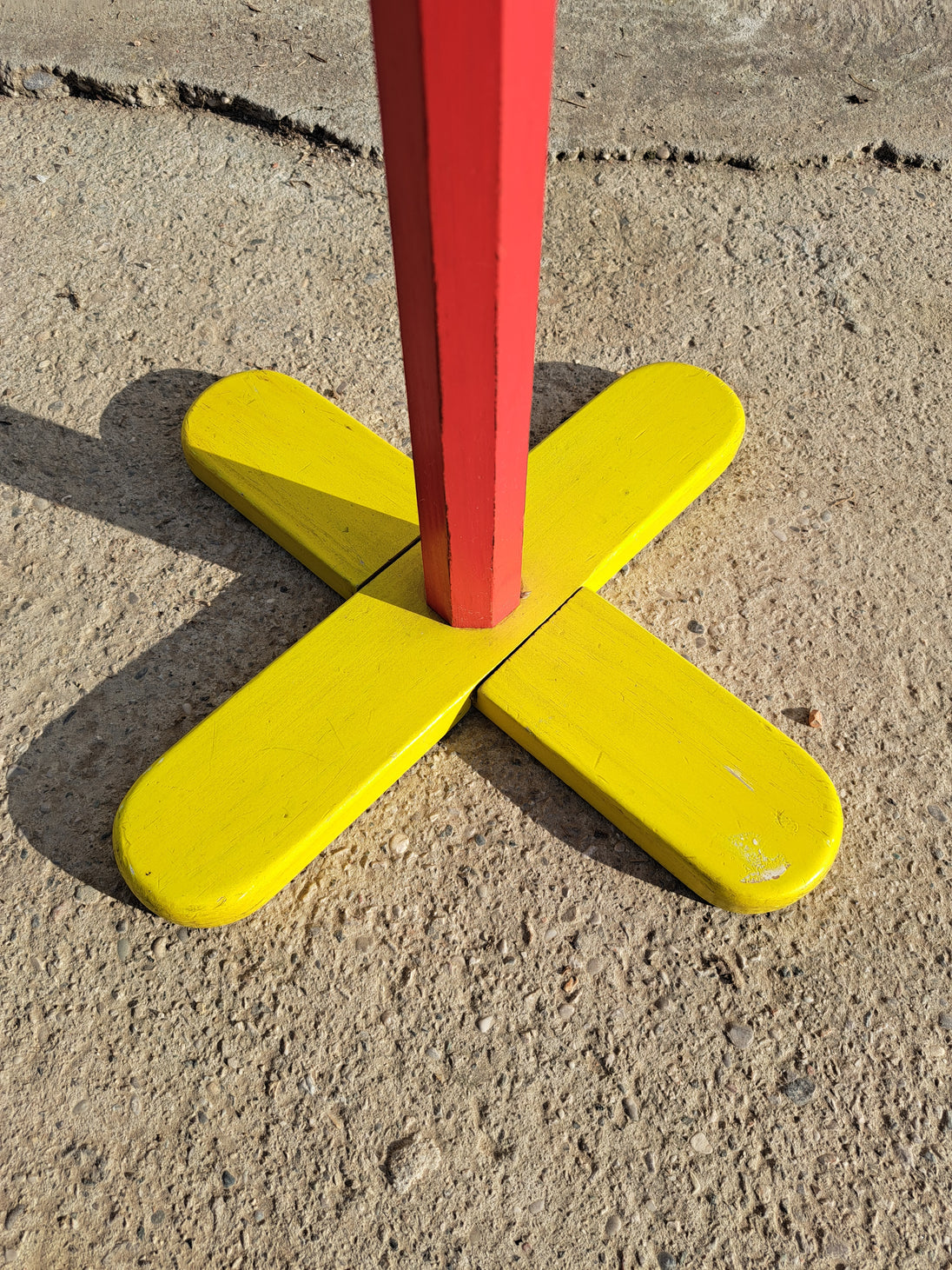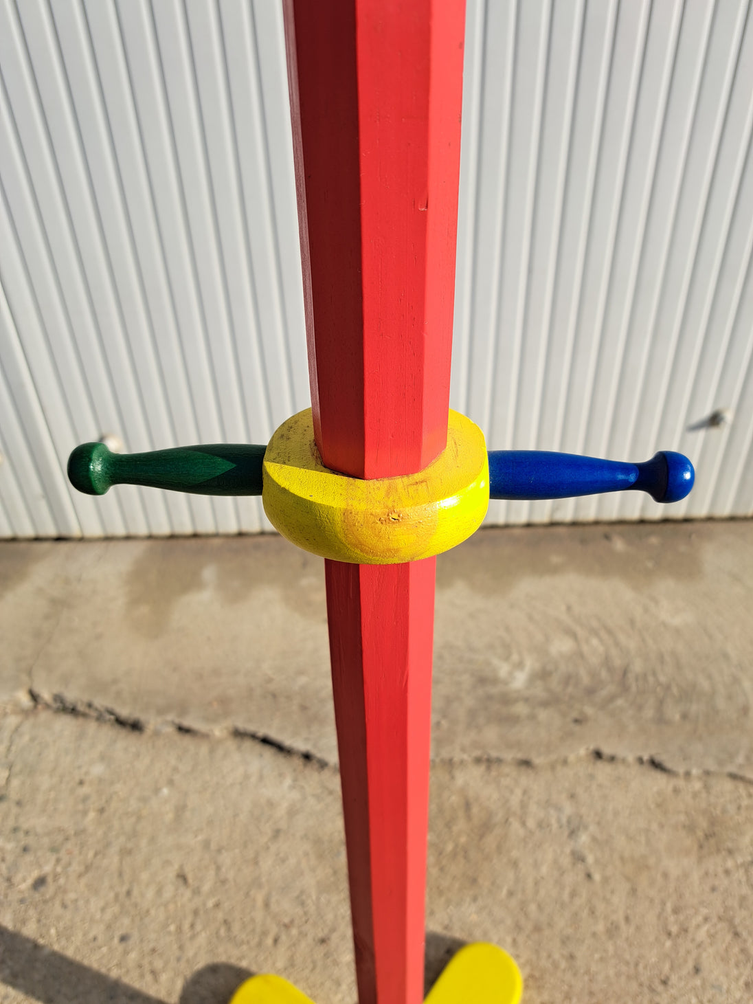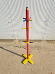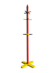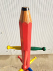 Dalla forma simpatica e dai colori accesi, questo attaccapanni a piantana è attribuibile a Pierre Sala, designer francese famoso per i suoi progetti a forma di matita, disegnati negli anni '80 e pensati come elementi d'arredo per bambini. Presenta dieci appendini colorati posizionati lungo la struttura centrale, è composto in legno verniciato nelle tinte primarie: rosso, giallo, blu, verde. Buone condizioni generali con alcuni segni di utilizzo e del tempo, come evidenziato in foto.