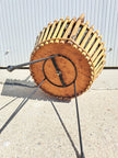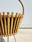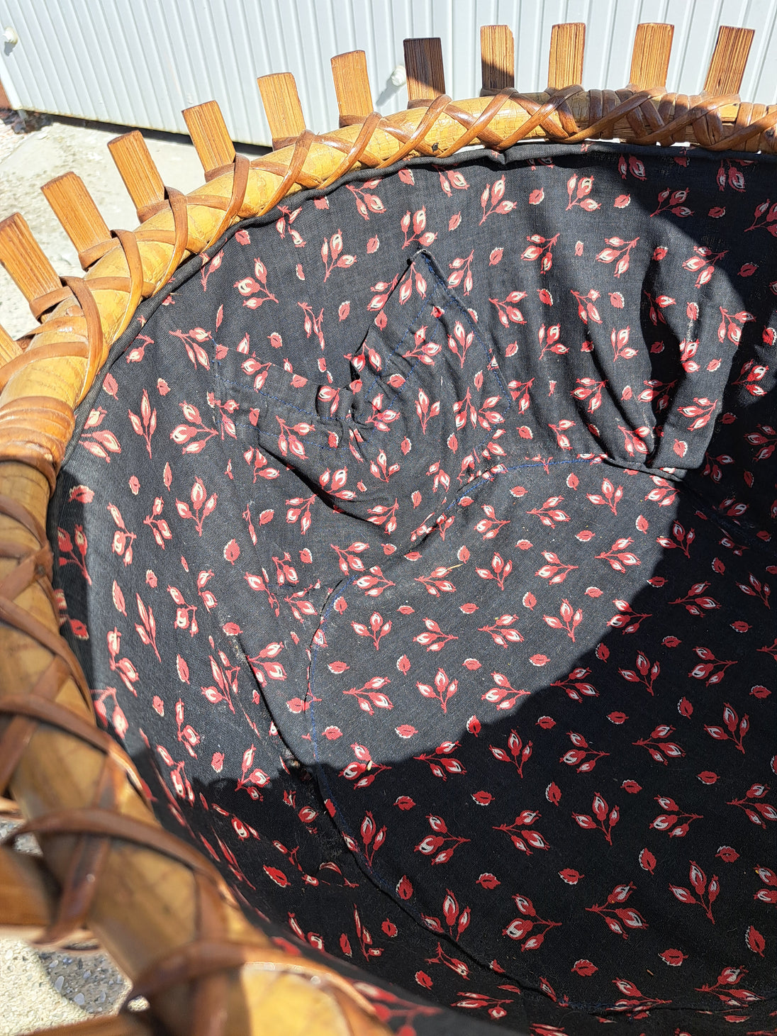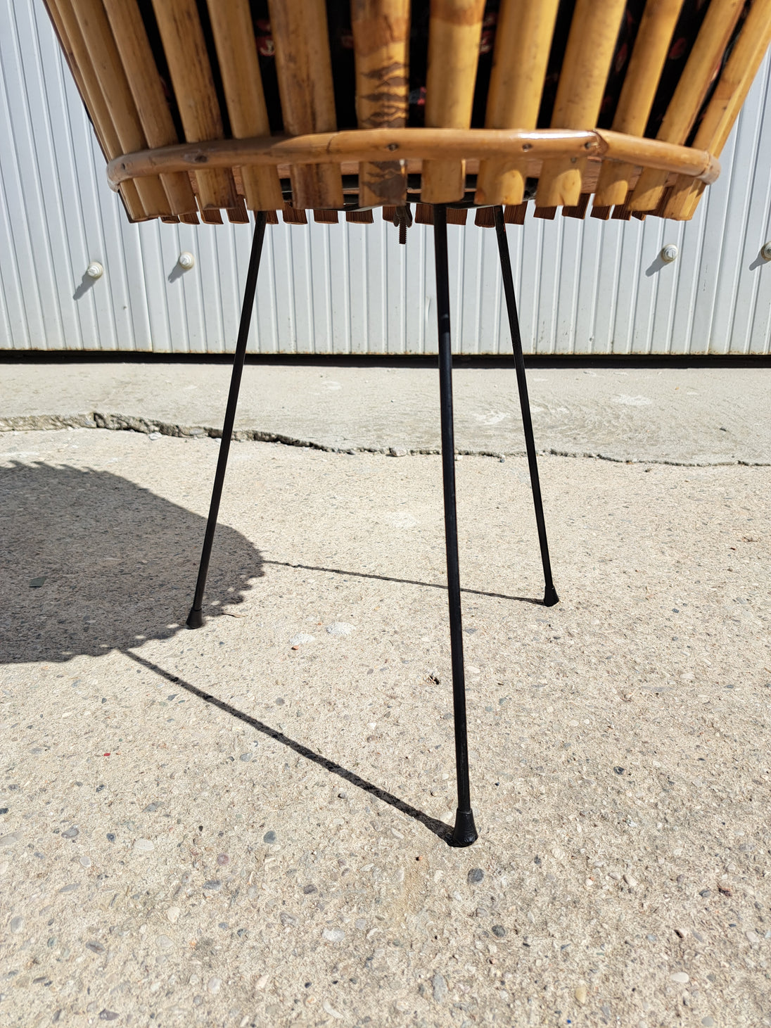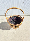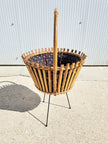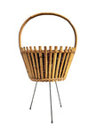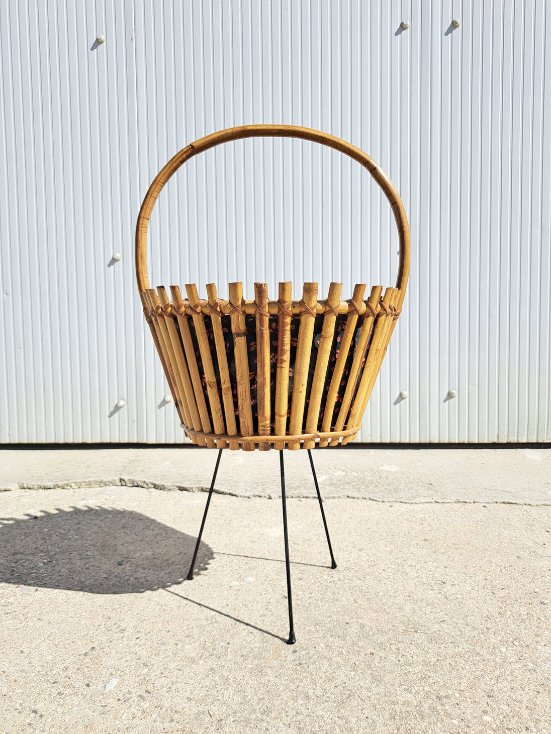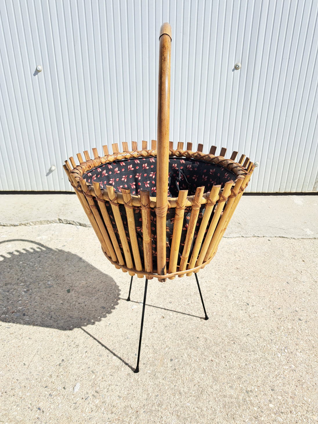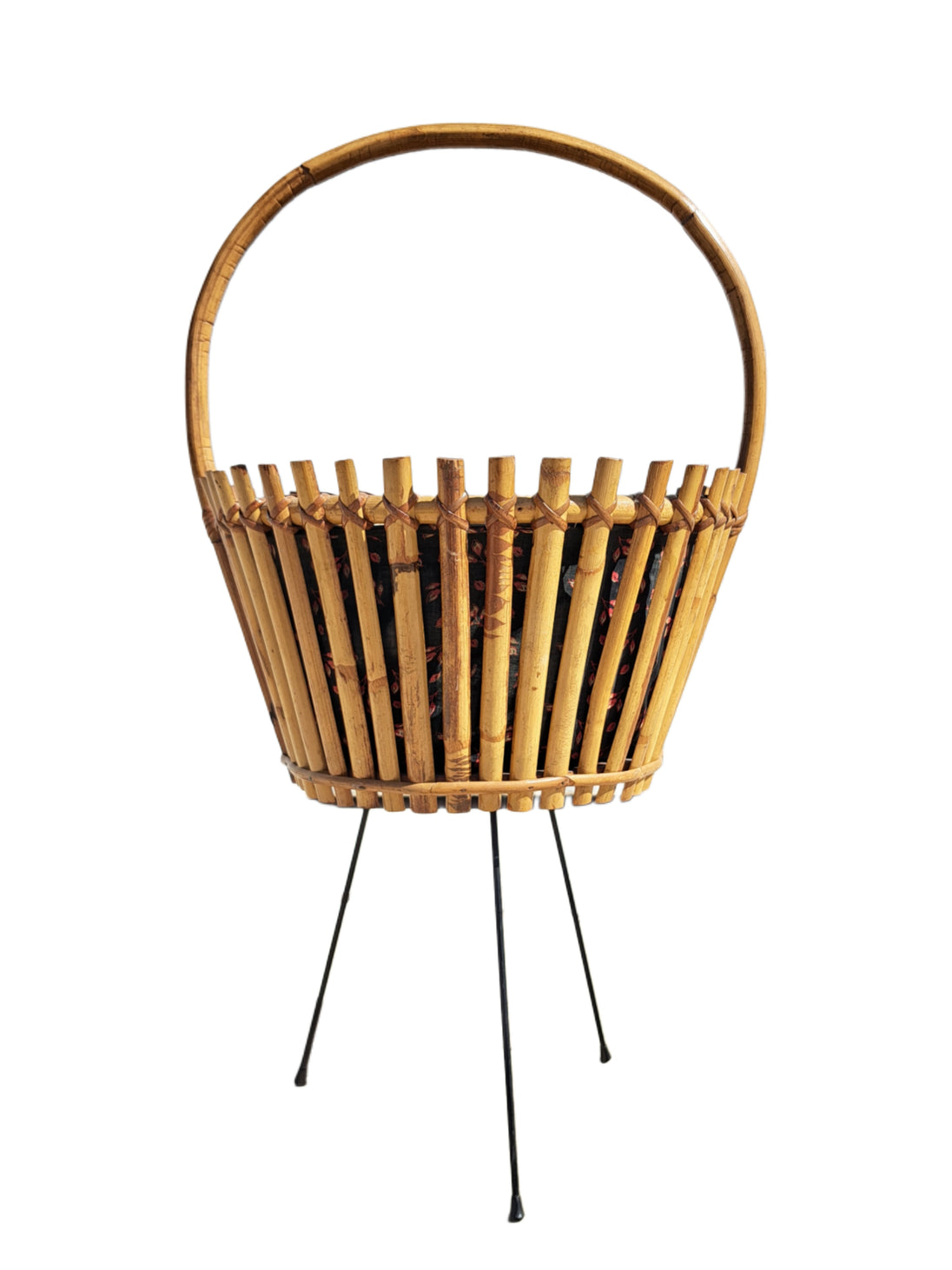 Cesto porta gomitoli e strumenti per cucito, struttura in legno di bambù su tripode in metallo. Forma circolare con un grande manico e struttura in listelli di bambù, interno foderato in stoffa blu scuro/nero con stampa a fiori rossi e bianchi e cucite due comode tasche porta strumenti. Prodotto anni 60, questo oggetto assisteva le donne che ricamavano, veniva posizionato a lato della sedia e permetteva di avere tutto l'occorrente a portata di mano, ad oggi può essere reinventato come portaoggetti per il salone o la camera, un porta cuscini da affiancare al divano o porta asciugamani da posizionare in bagno. Ottime condizioni con leggeri segni del tempo e di utilizzo.