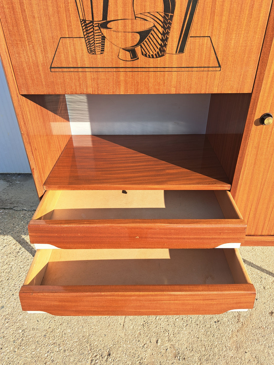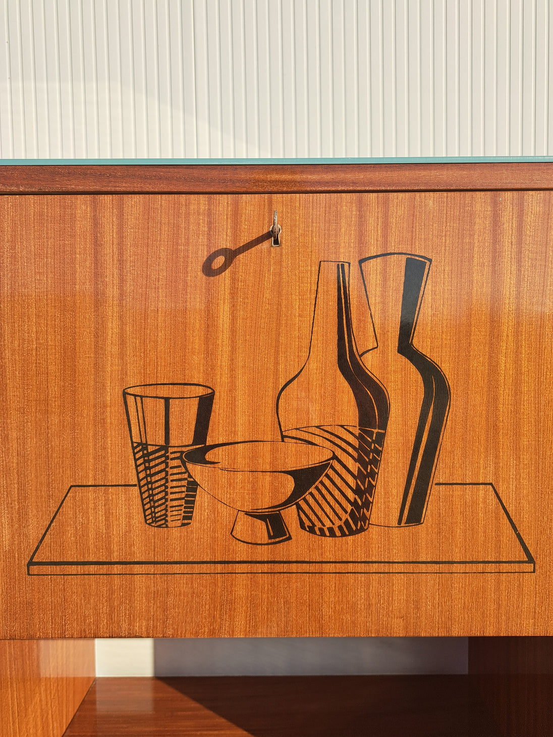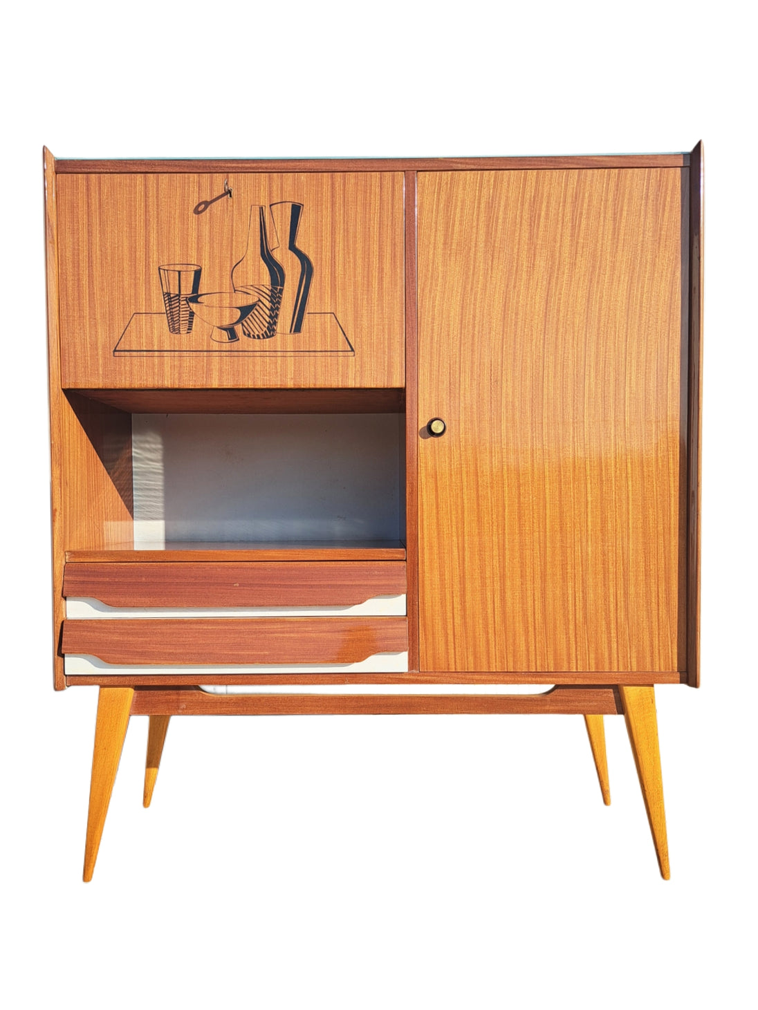 Mobile bar in legno, produzione italiana anni 50 / 60 con disegno a silhouette di bottiglie e bicchieri. Credenza compatta e funzionale con ripiani, ante e cassetti, corpo sollevato su alte zampe a spillo. Colore marrone chiaro con dettagli bianchi, vetro azzurro e pomello in ottone dorato. Eleganti profili sagomati secondo lo stile dell'epoca mid century. Ottime condizioni generali con alcuni segni dell'età e dell'utilizzo.