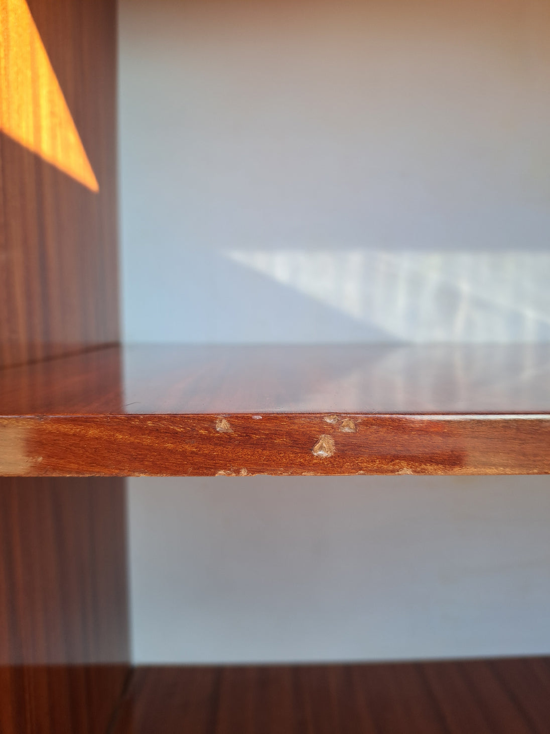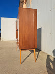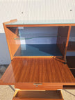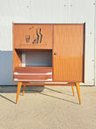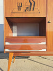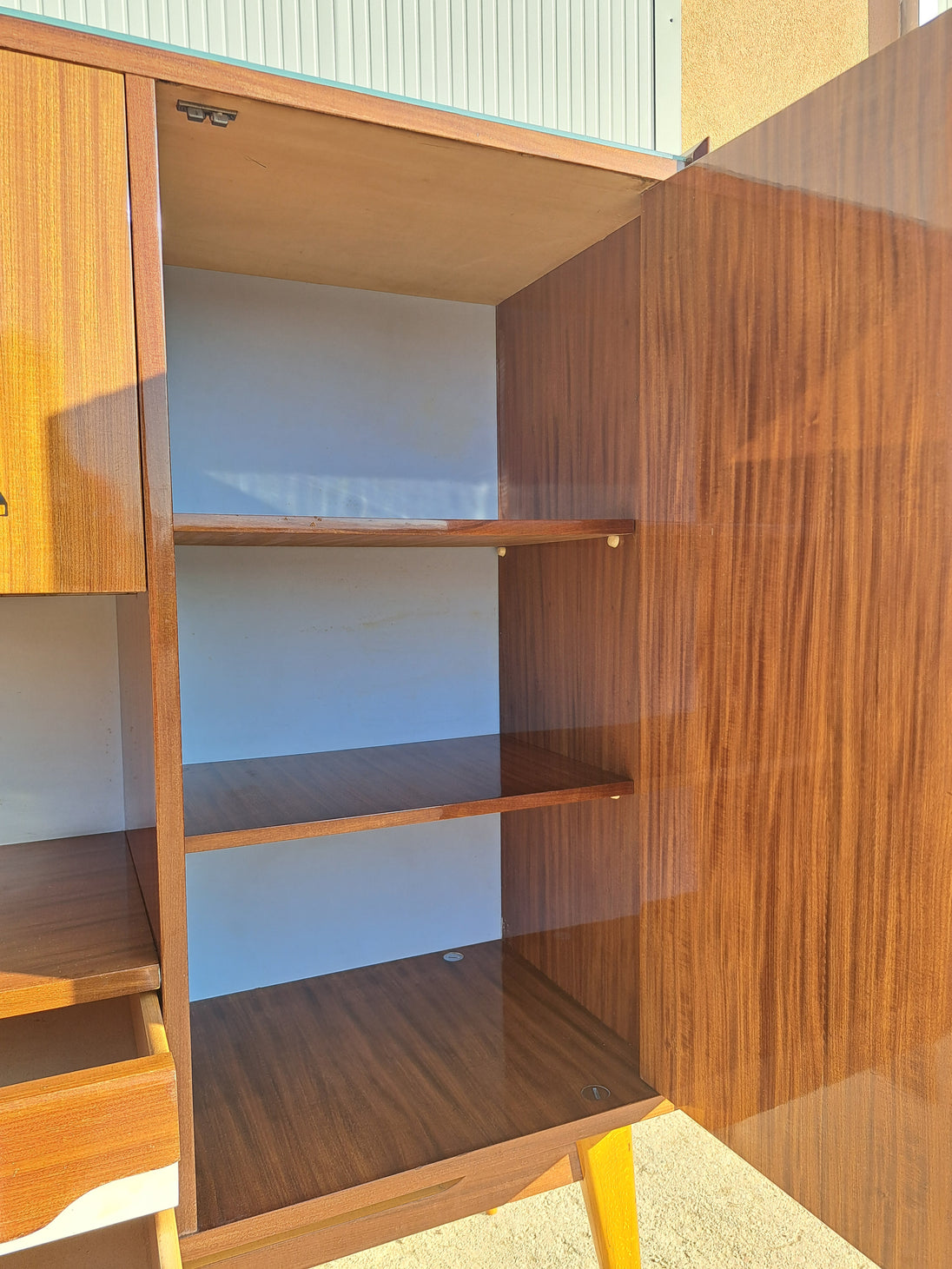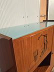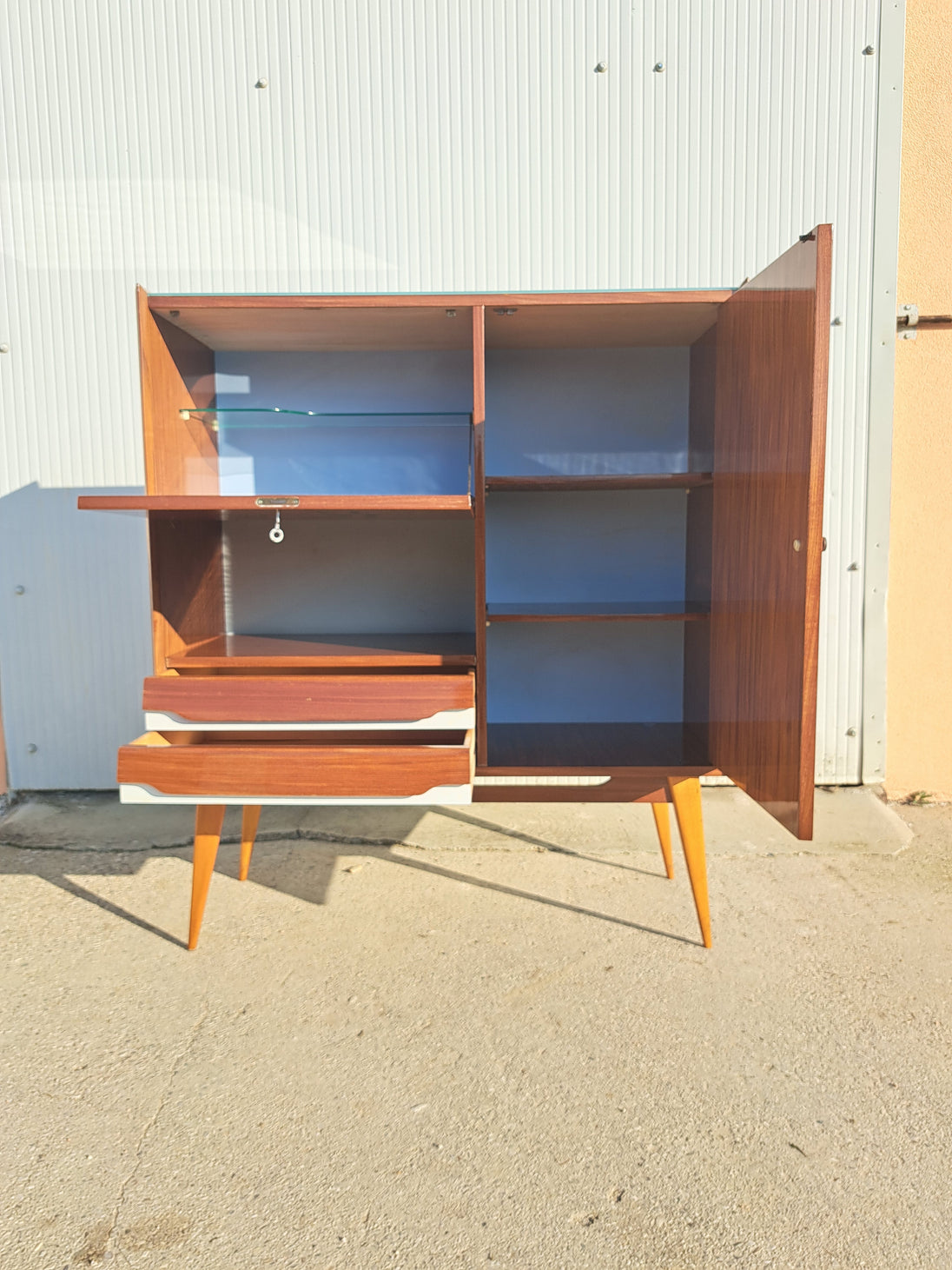 Mobile bar in legno, produzione italiana anni 50 / 60 con disegno a silhouette di bottiglie e bicchieri. Credenza compatta e funzionale con ripiani, ante e cassetti, corpo sollevato su alte zampe a spillo. Colore marrone chiaro con dettagli bianchi, vetro azzurro e pomello in ottone dorato. Eleganti profili sagomati secondo lo stile dell'epoca mid century. Ottime condizioni generali con alcuni segni dell'età e dell'utilizzo.