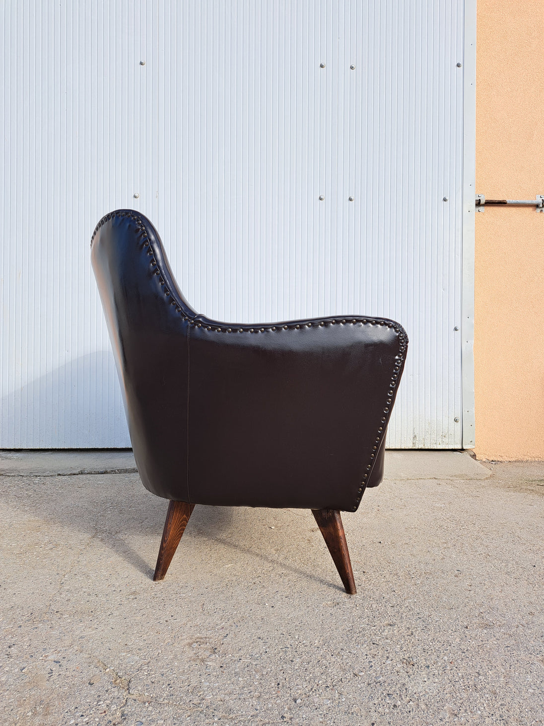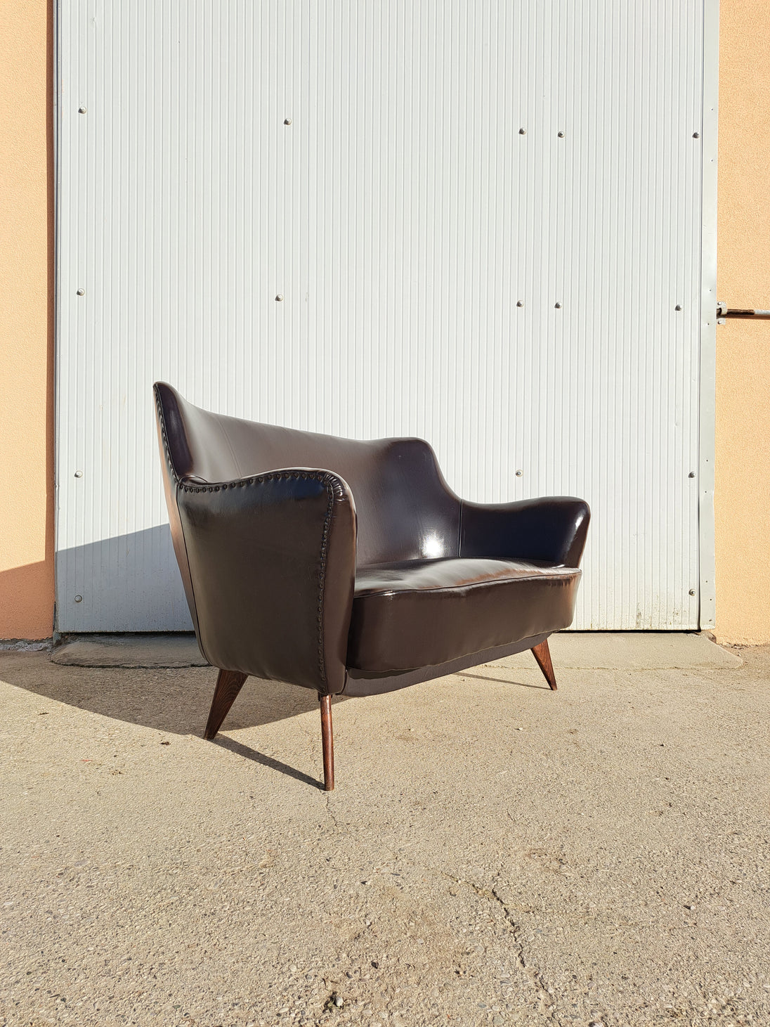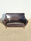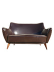 Divano attribuibile alla linea Perla, disegnato da Giulia Veronesi per ISA Bergamo negli anni 50. Divanetto rivestito in pelle marrone scuro con inserti di borchie lungo le cuciture, alla base zampe coniche in legno. Si distingue per le sue forme morbide e avvolgenti: lo schienale e i braccioli creano un unico volume curvo che rende la seduta accogliente e confortevole. Mentre le gambe sottili e leggermente inclinate alleggeriscono visivamente la struttura, dando al divano un aspetto raffinato e slanciato. Grazie al suo equilibrio tra comfort e stile, la linea Perla si inserisce facilmente sia in interni moderni sia in ambienti più classici, portando con sé il fascino del design italiano di metà secolo. Buone condizioni generali con alcuni segni del tempo, si evidenziano due piccole lacerazioni sulla pelle di un bracciolo e della seduta.