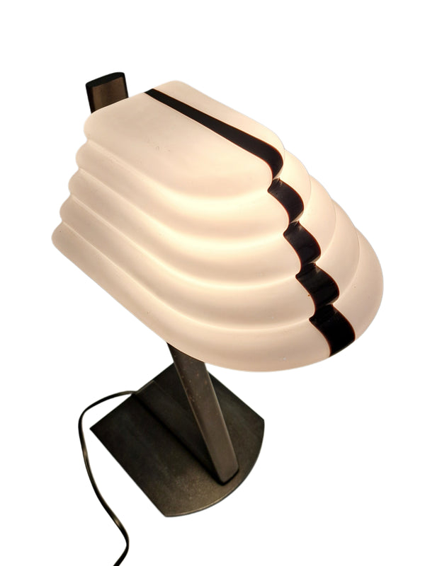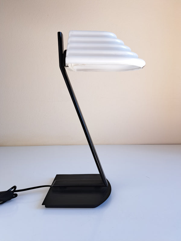 Lampada orientabile da scrivania modello Flex disegnata da Vico Magistretti per Emmedi negli anni 70. Grande lampada da tavolo o scrivania in plastica rossa e nera. Buone condizioni generali con segni del tempo e di utilizzo, funzionante (lampadina E27) e con cavo originale, si evidenziano una crepa all'attacco del paralume ed una alla base.
